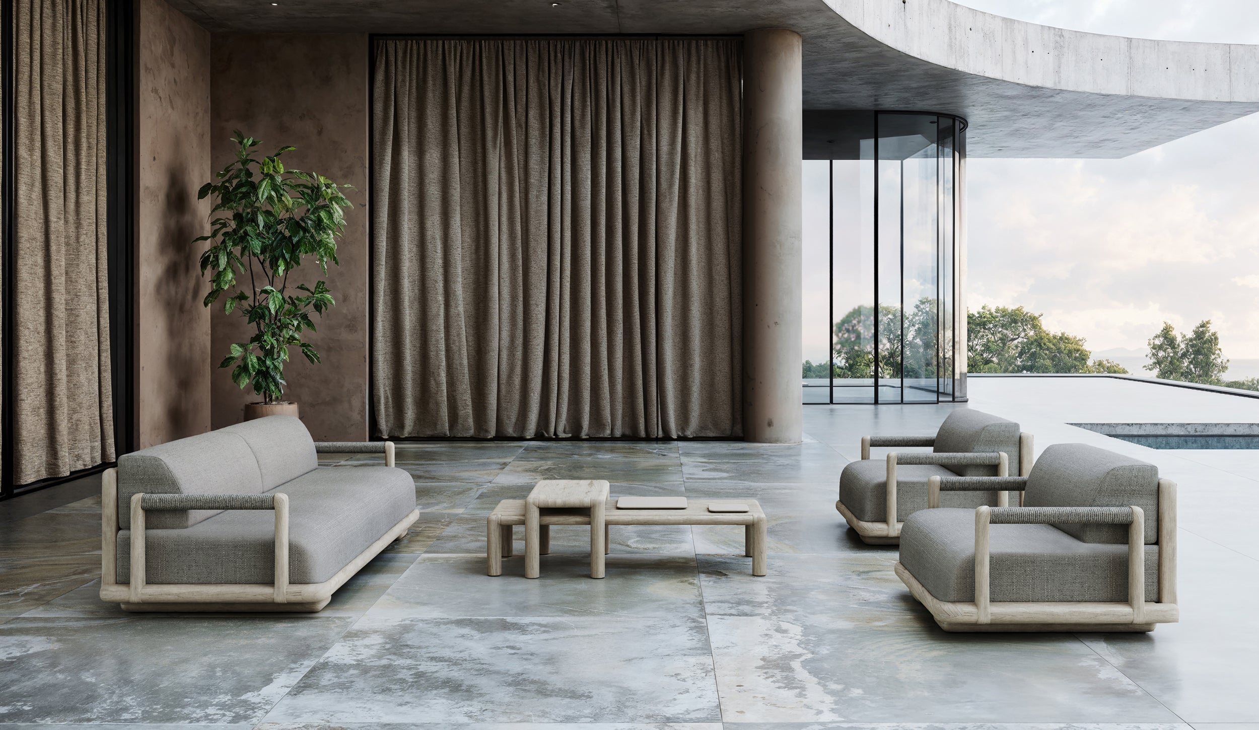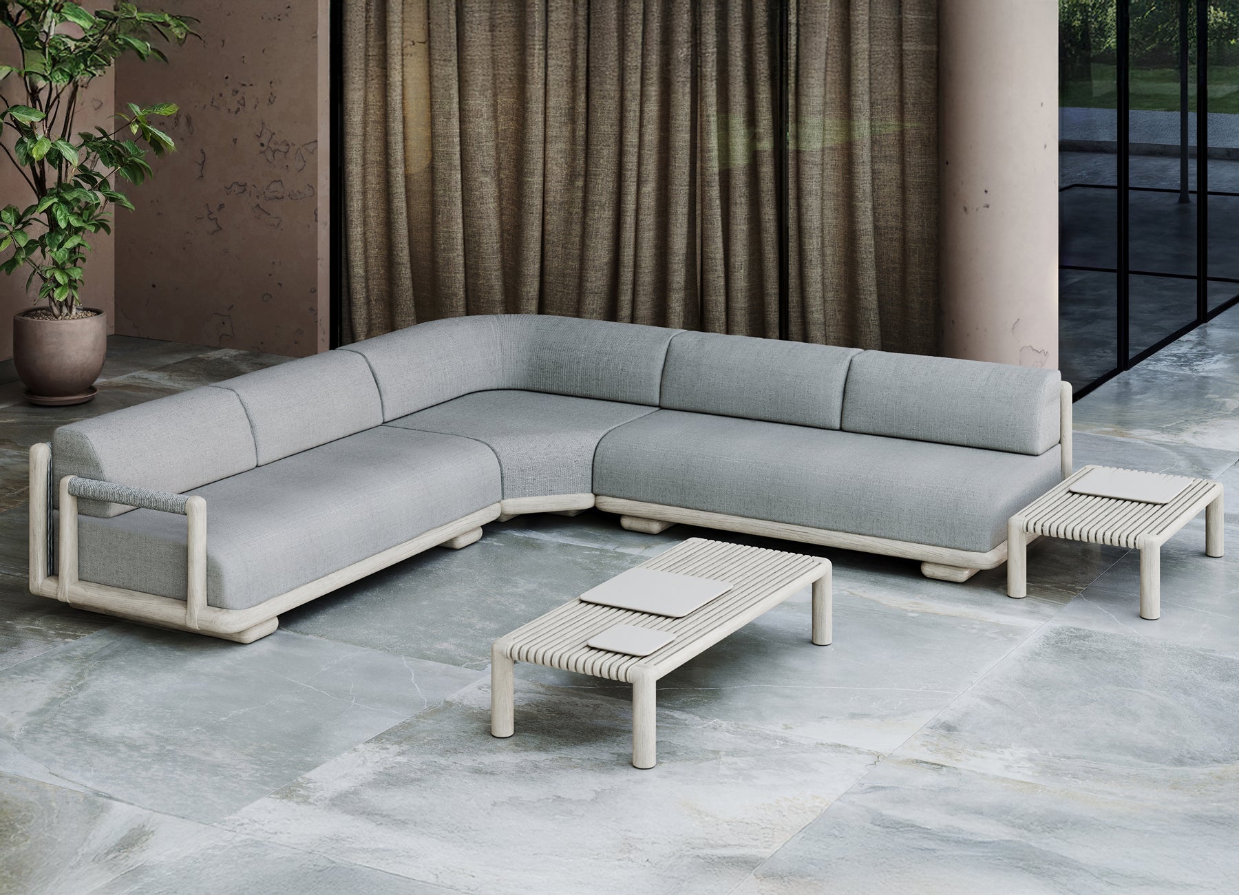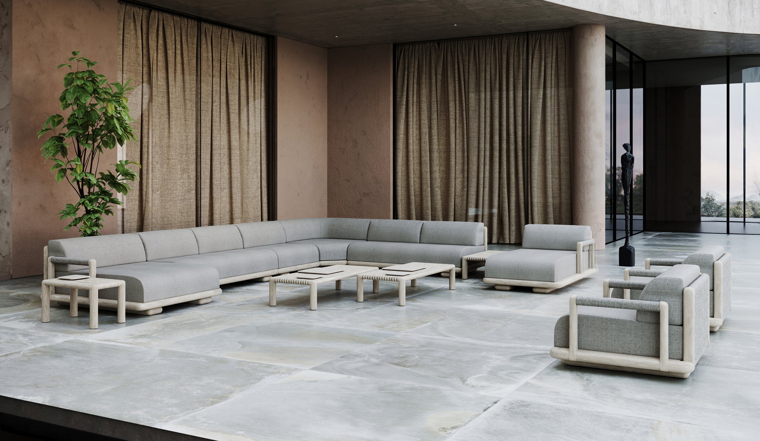 The Caleo Collection embodies understated luxury, blending contemporary form with timeless materials. Designed for both outdoor settings,this modular lounge series prioritizes comfort and adaptability, offering sleek, minimalist lines that define the space while providing unmatched flexibility.