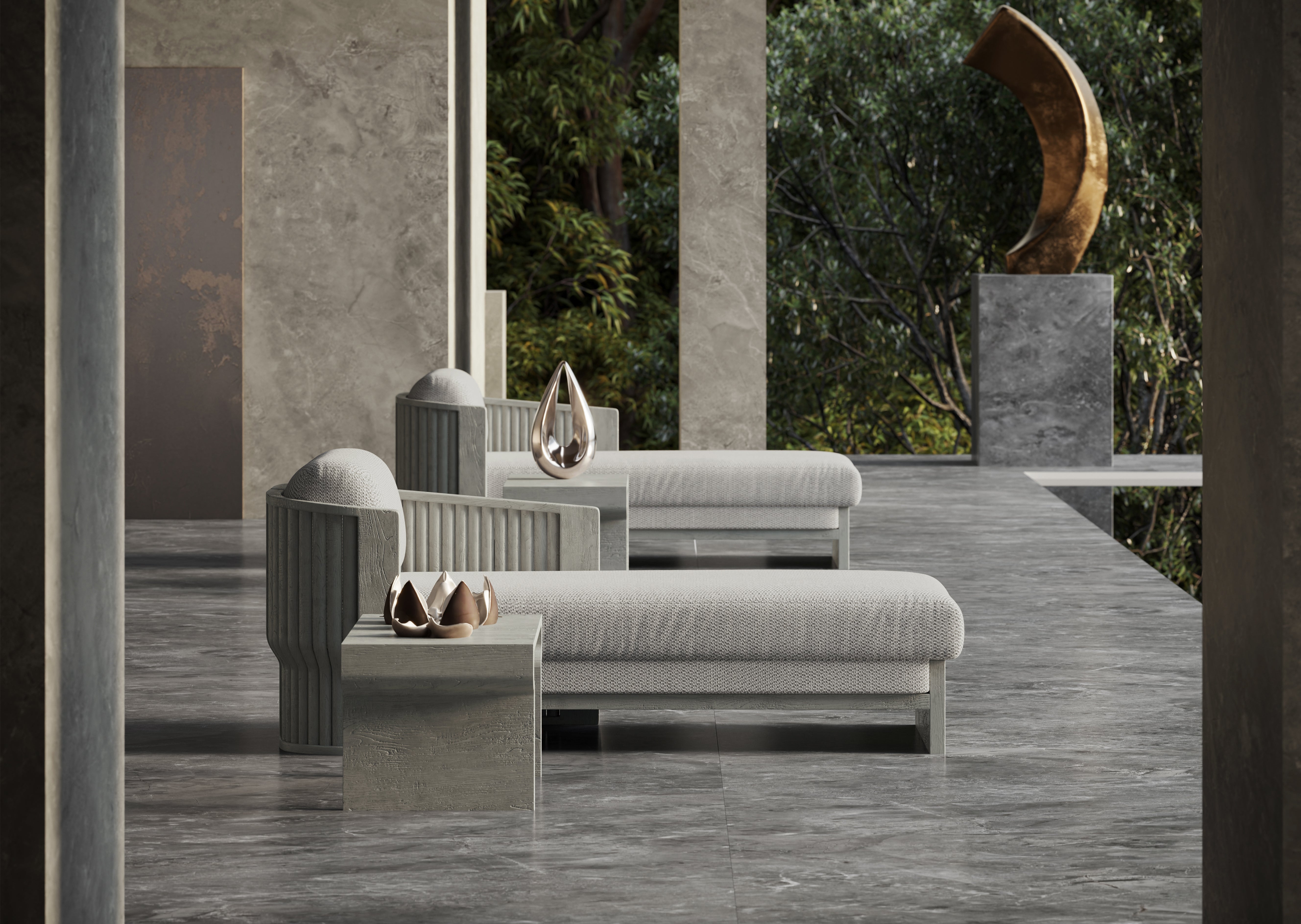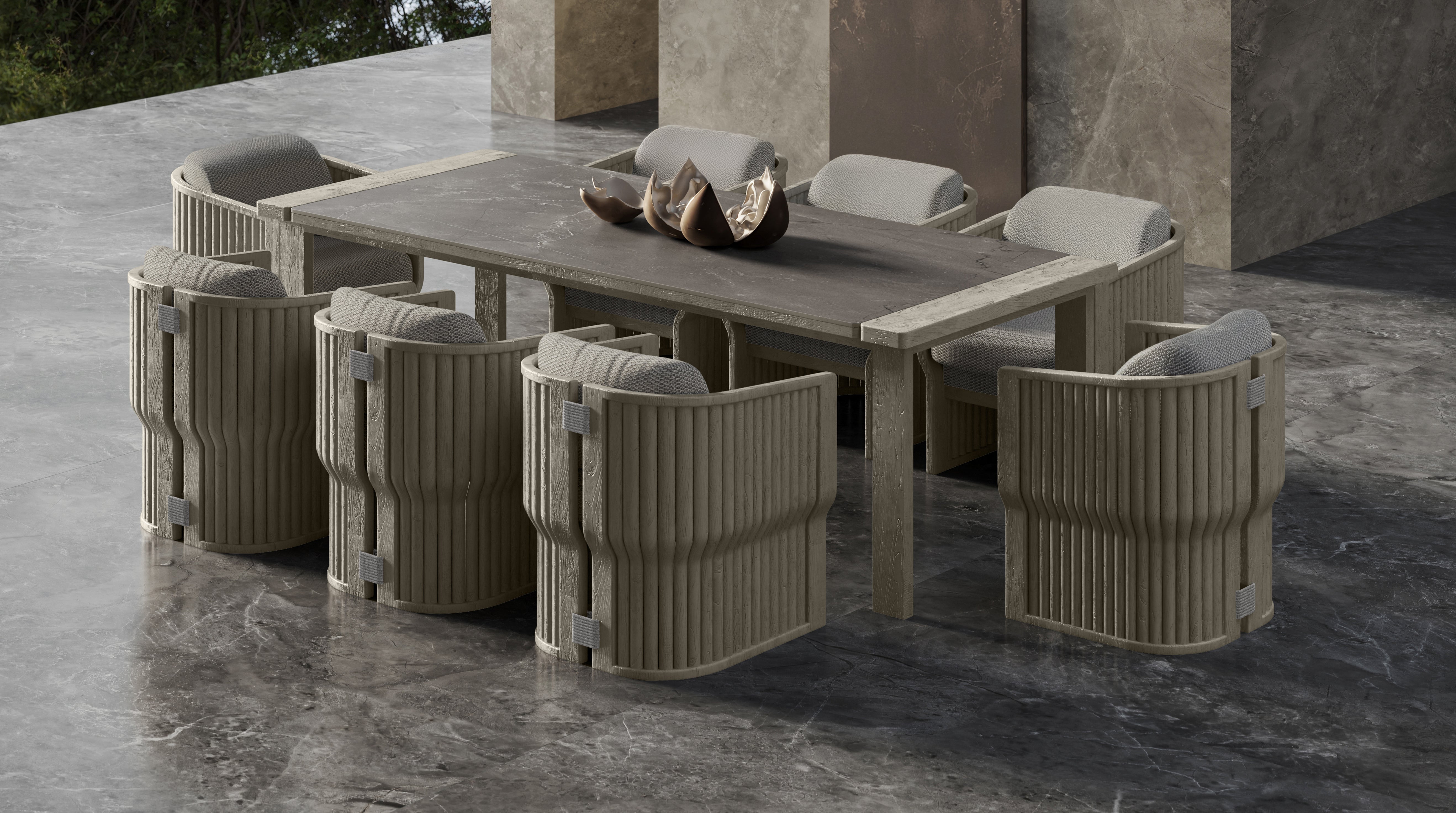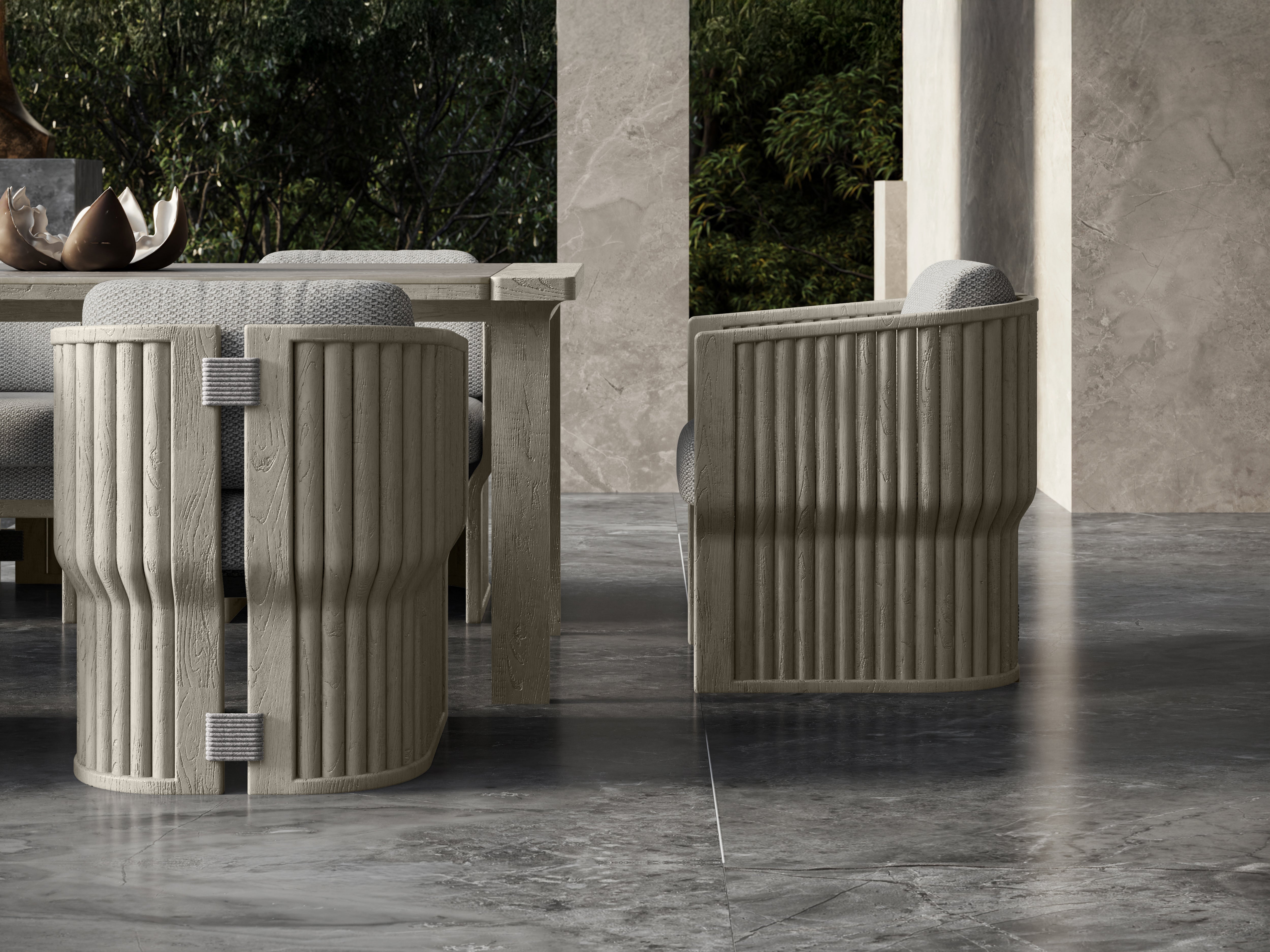Designed by Junpei and Iori Tamaki, the collection comprises a lounge set, a dining set, a sun lounger, and a daybed, each shaped with soft lines and a warm, tactile presence. Teak is complemented with subtle rope elements and stone-inspired surfaces, forming a balanced material composition that feels calm, intimate, and quietly expressive.