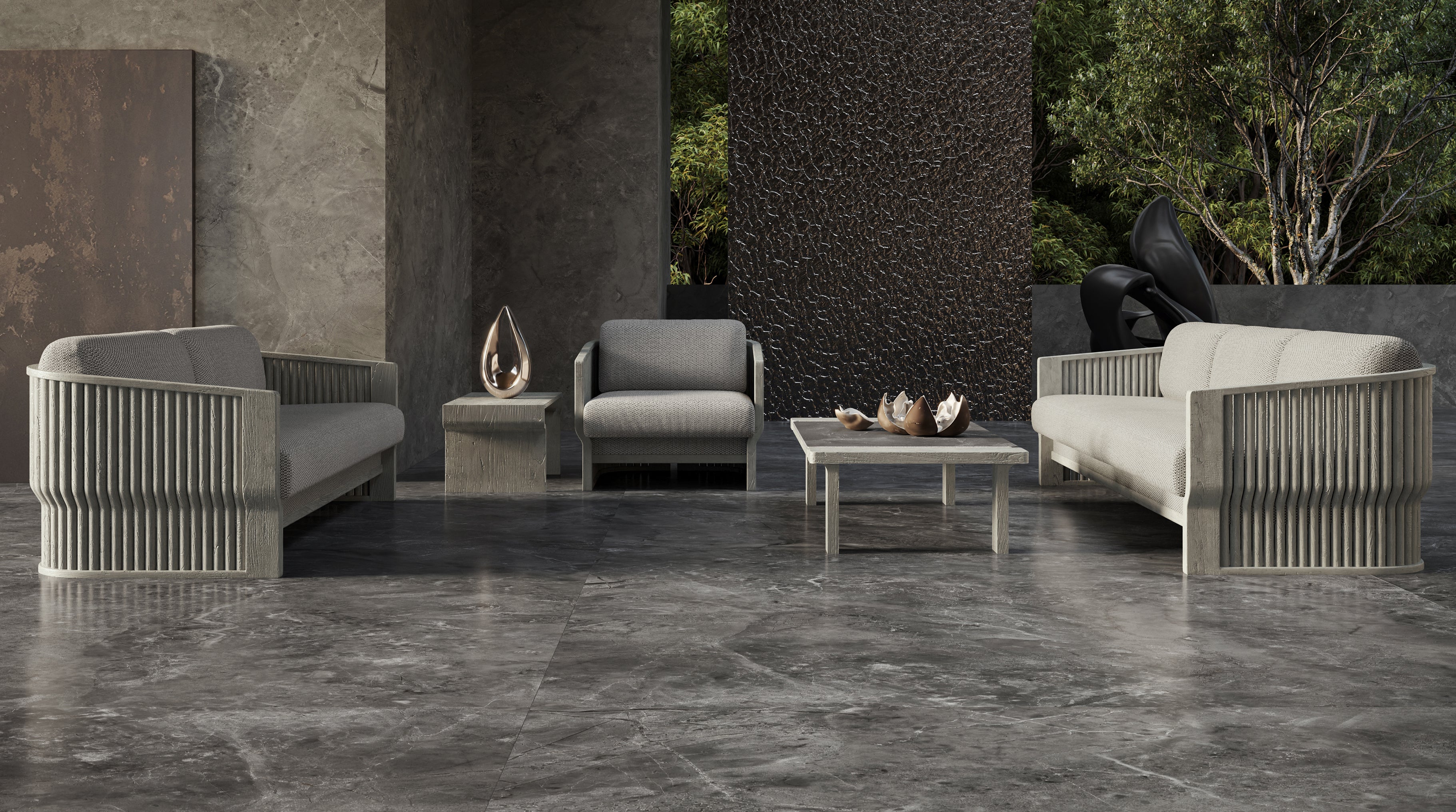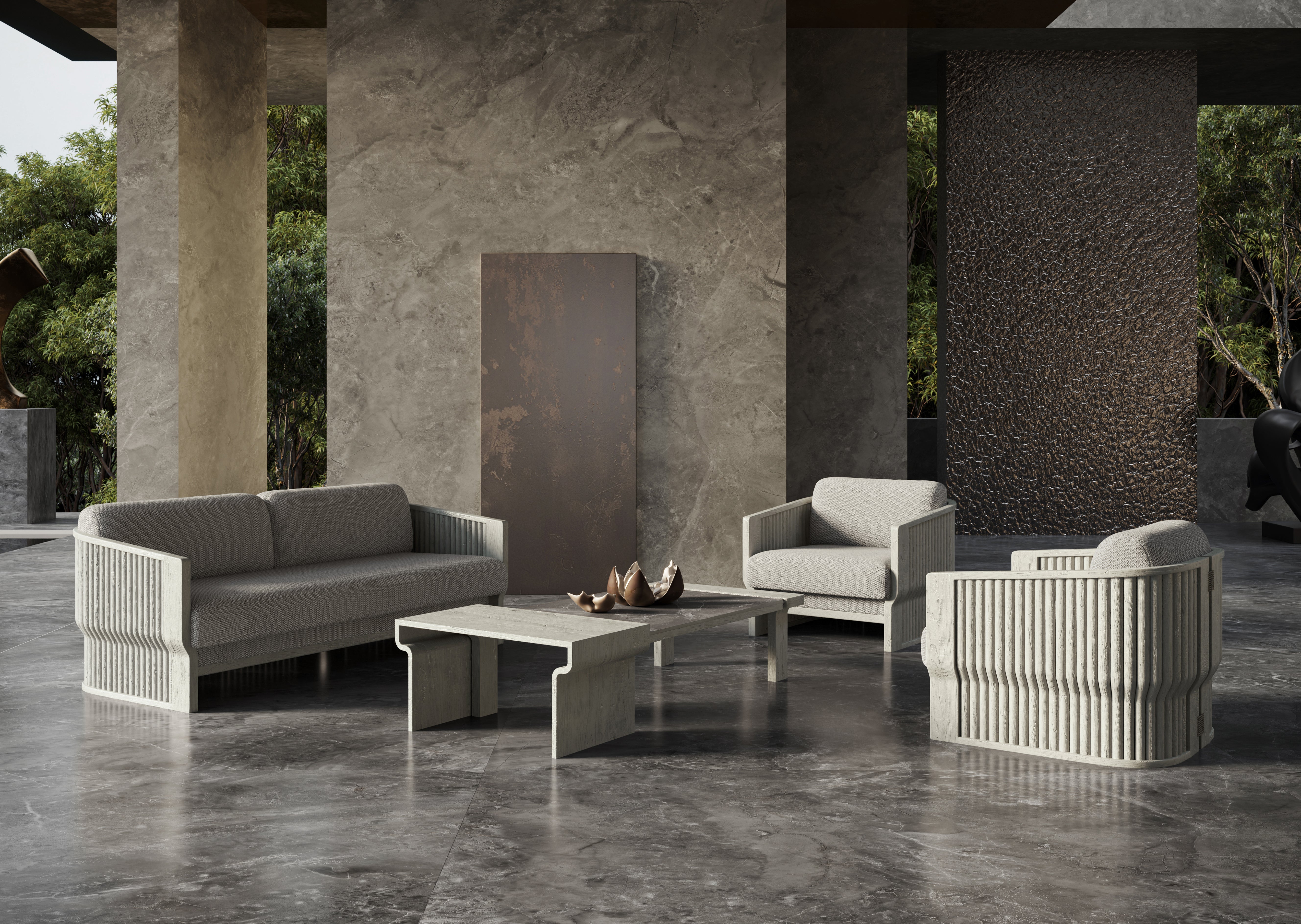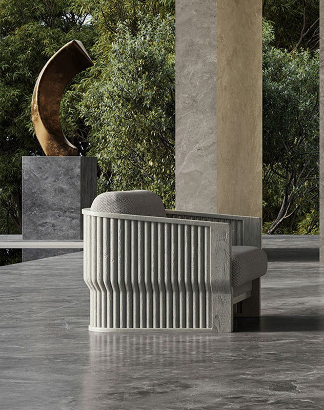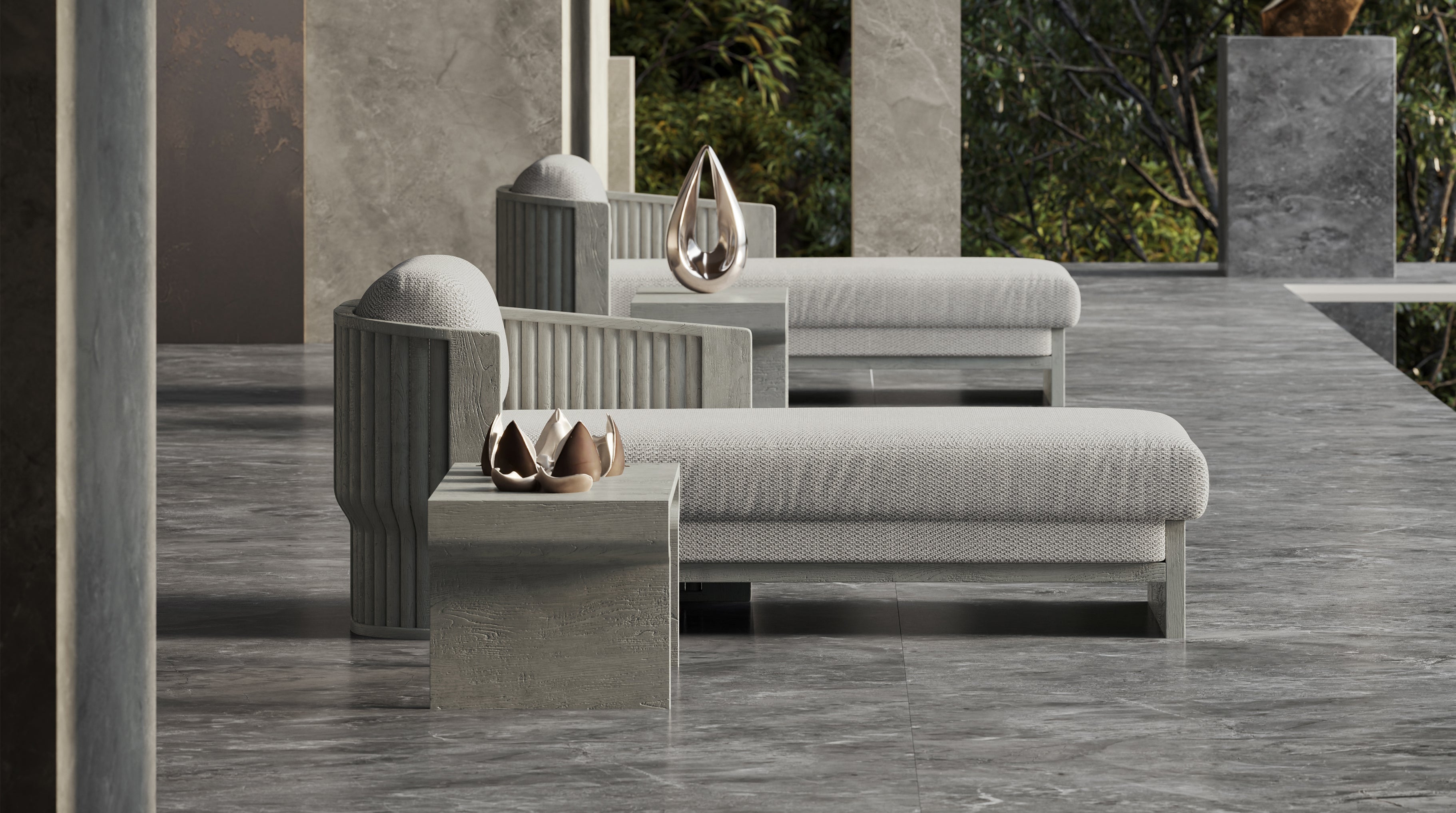 Designed by Junpei and Iori Tamaki, the collection comprises a lounge set, a dining set, a sun lounger, and a daybed, each shaped with soft lines and a warm, tactile presence. Teak is complemented with subtle rope elements and stone-inspired surfaces, forming a balanced material composition that feels calm, intimate, and quietly expressive.