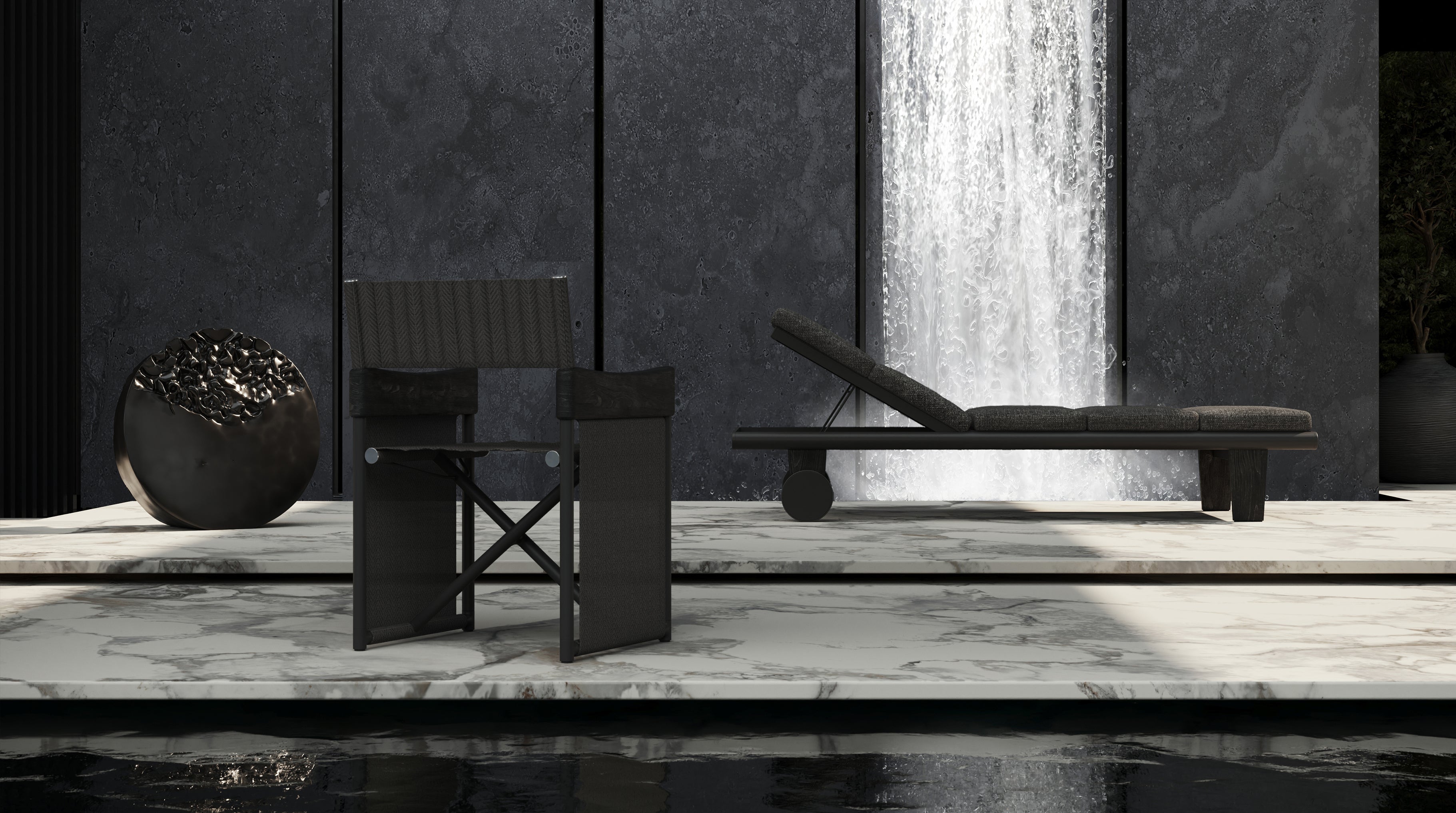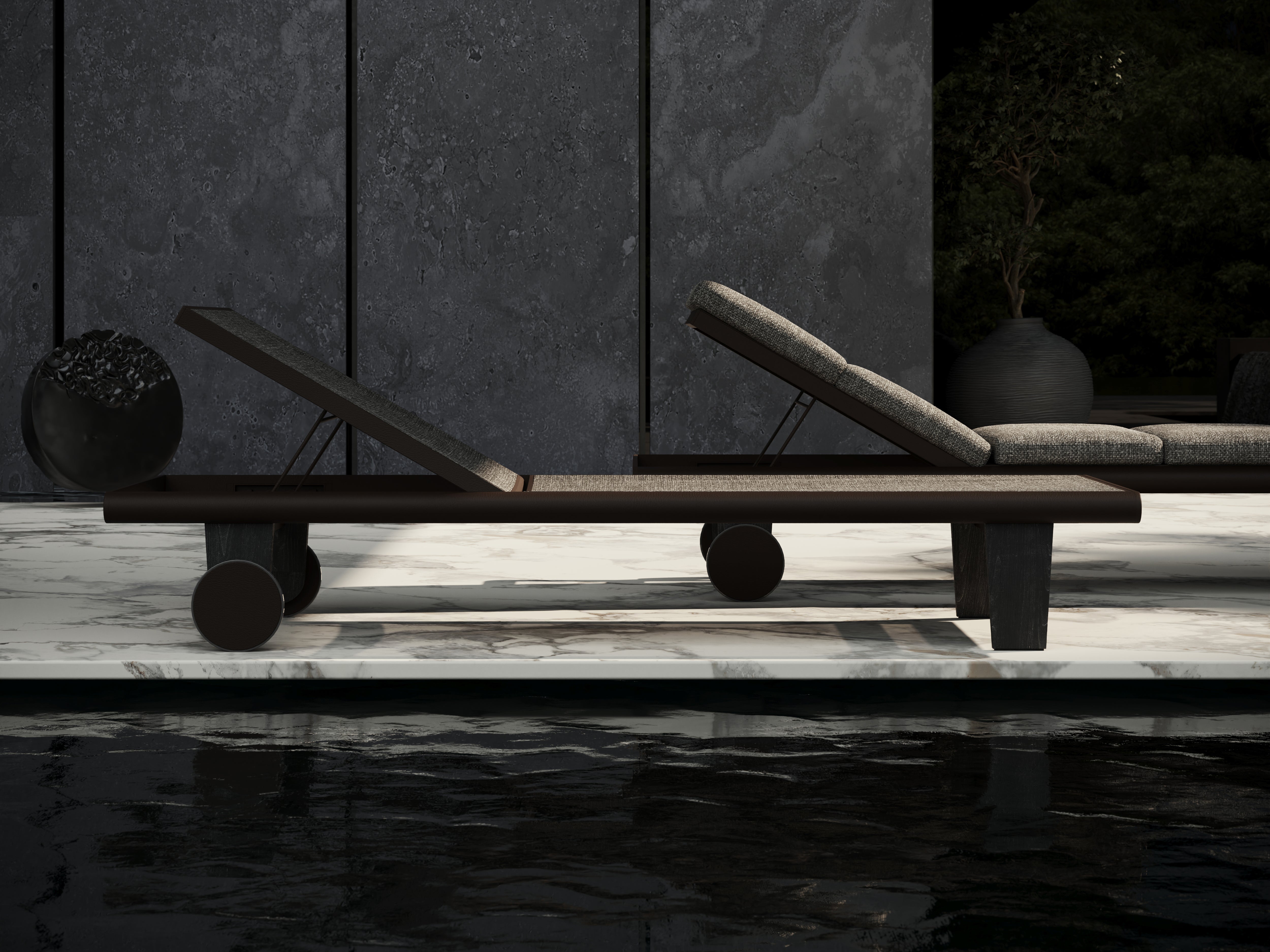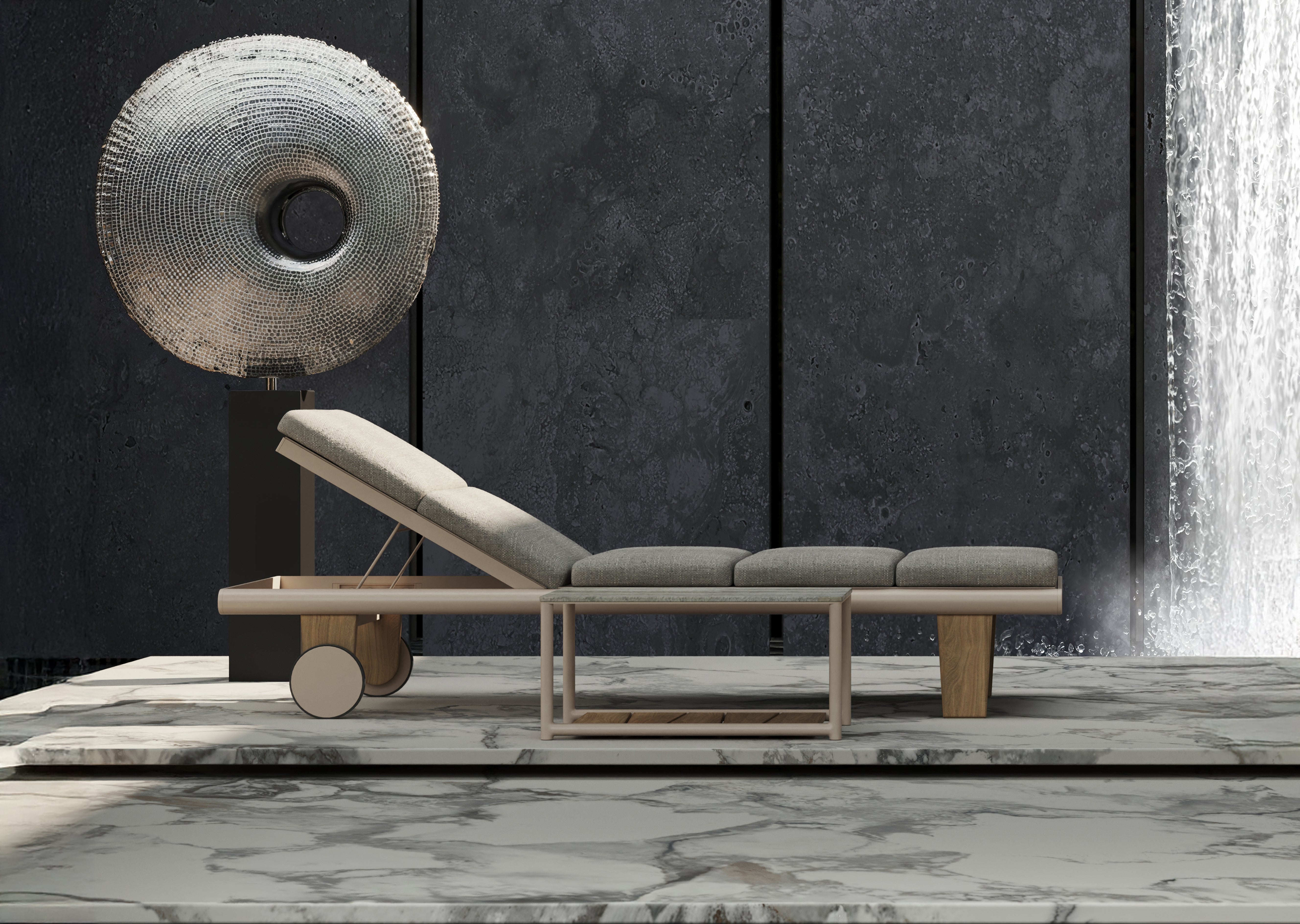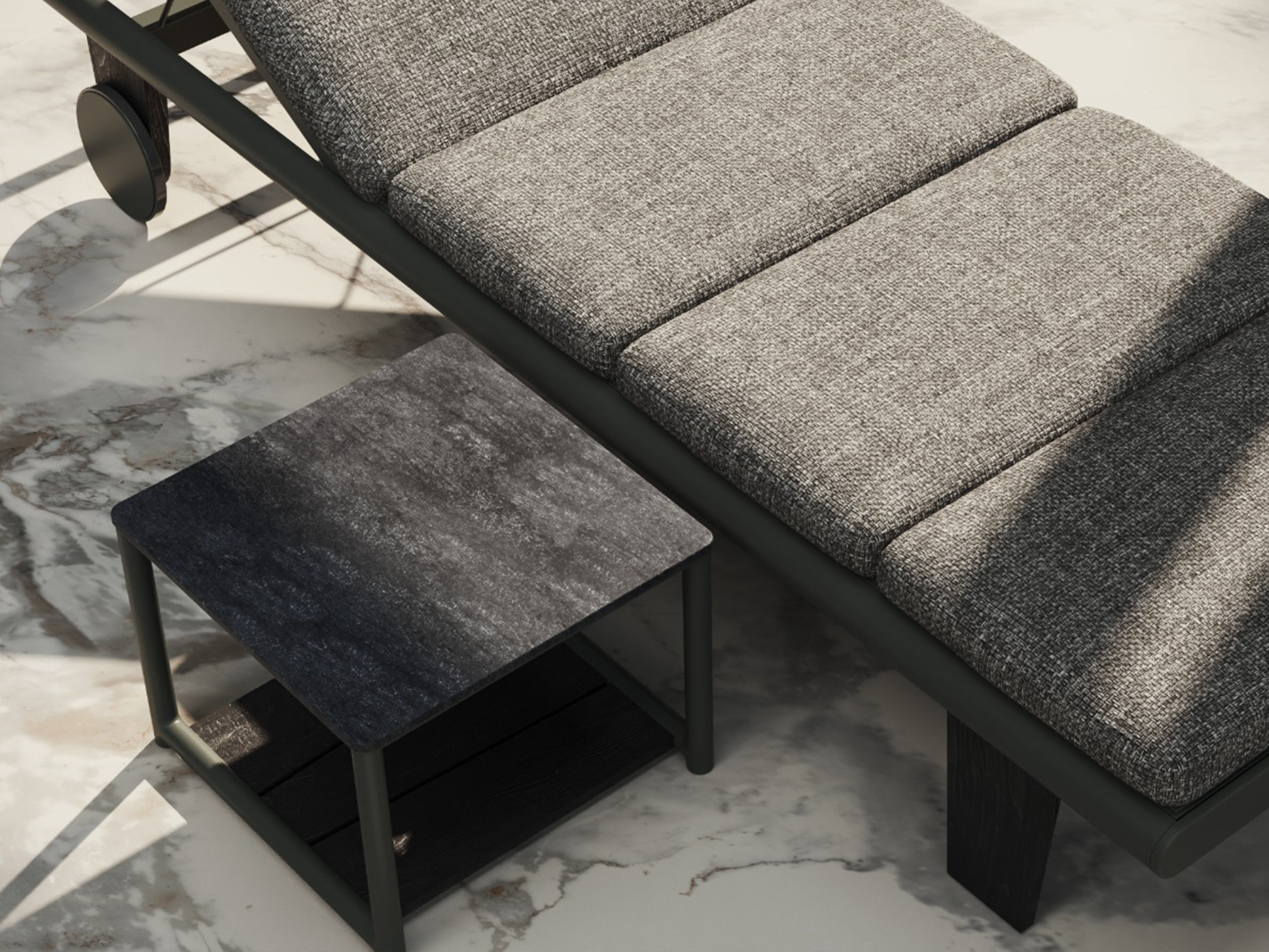 The director chair highlights this relationship through its aluminium frame and teak arm details, while the sun lounger extends the aesthetic with a clean, elongated profile. The coffee table completes the family with a quietly balanced combination of form and material.