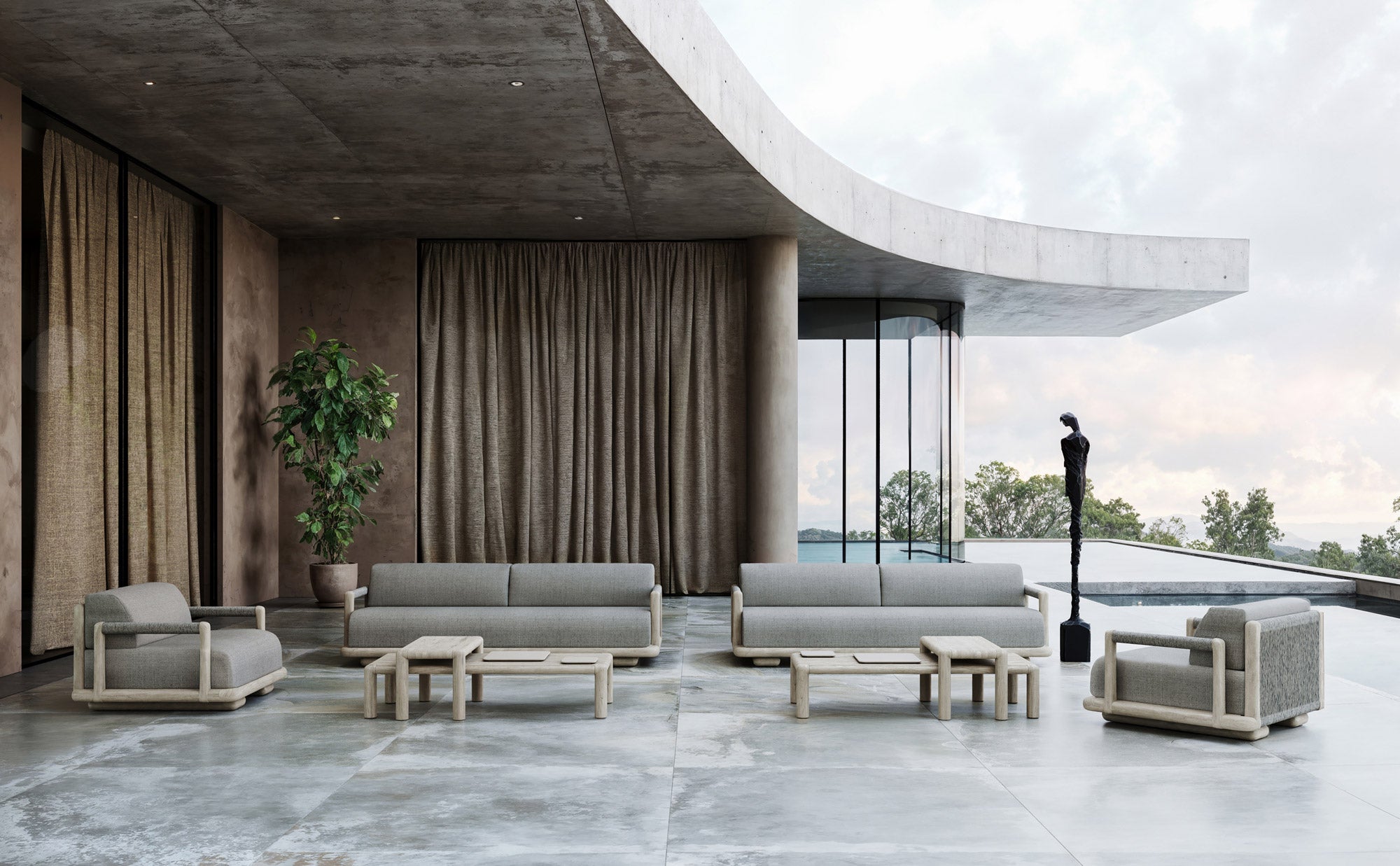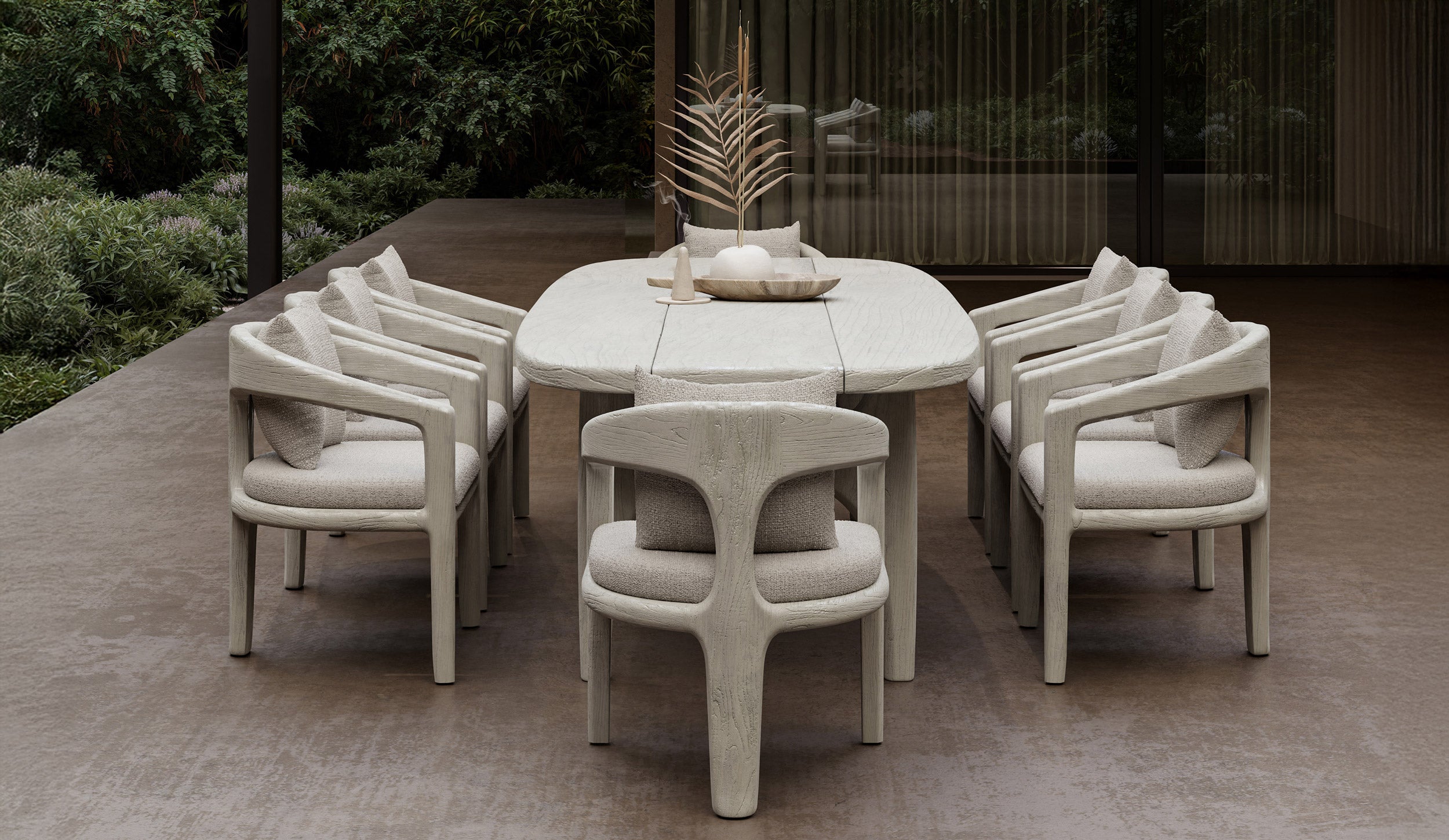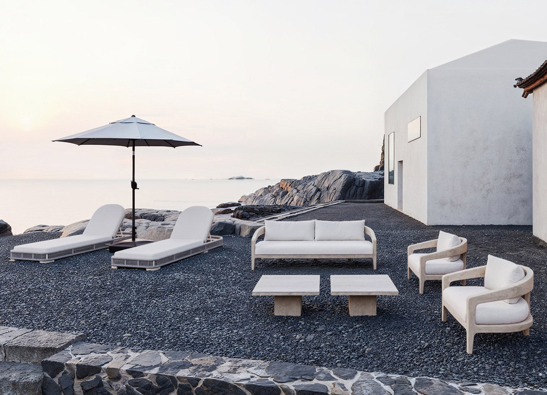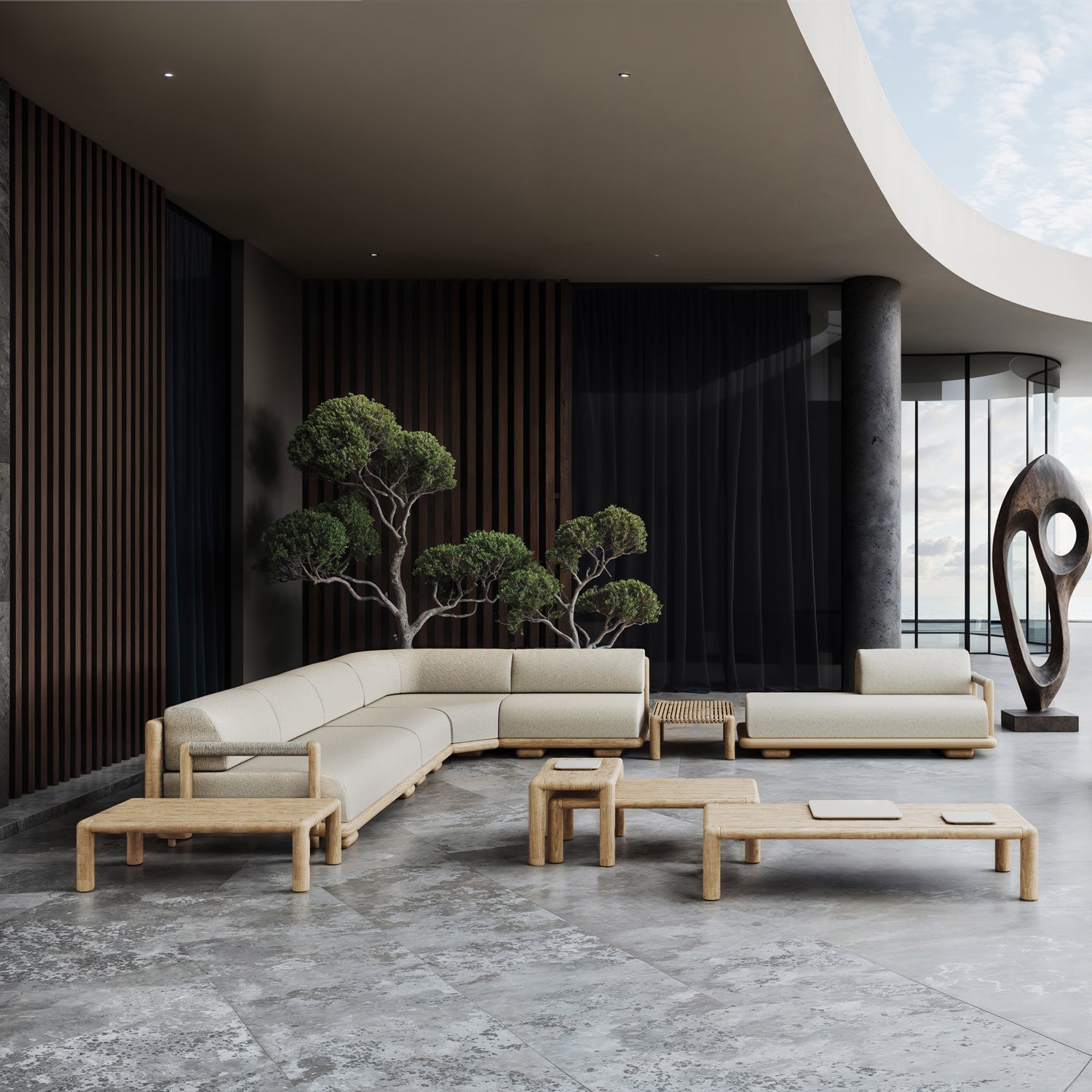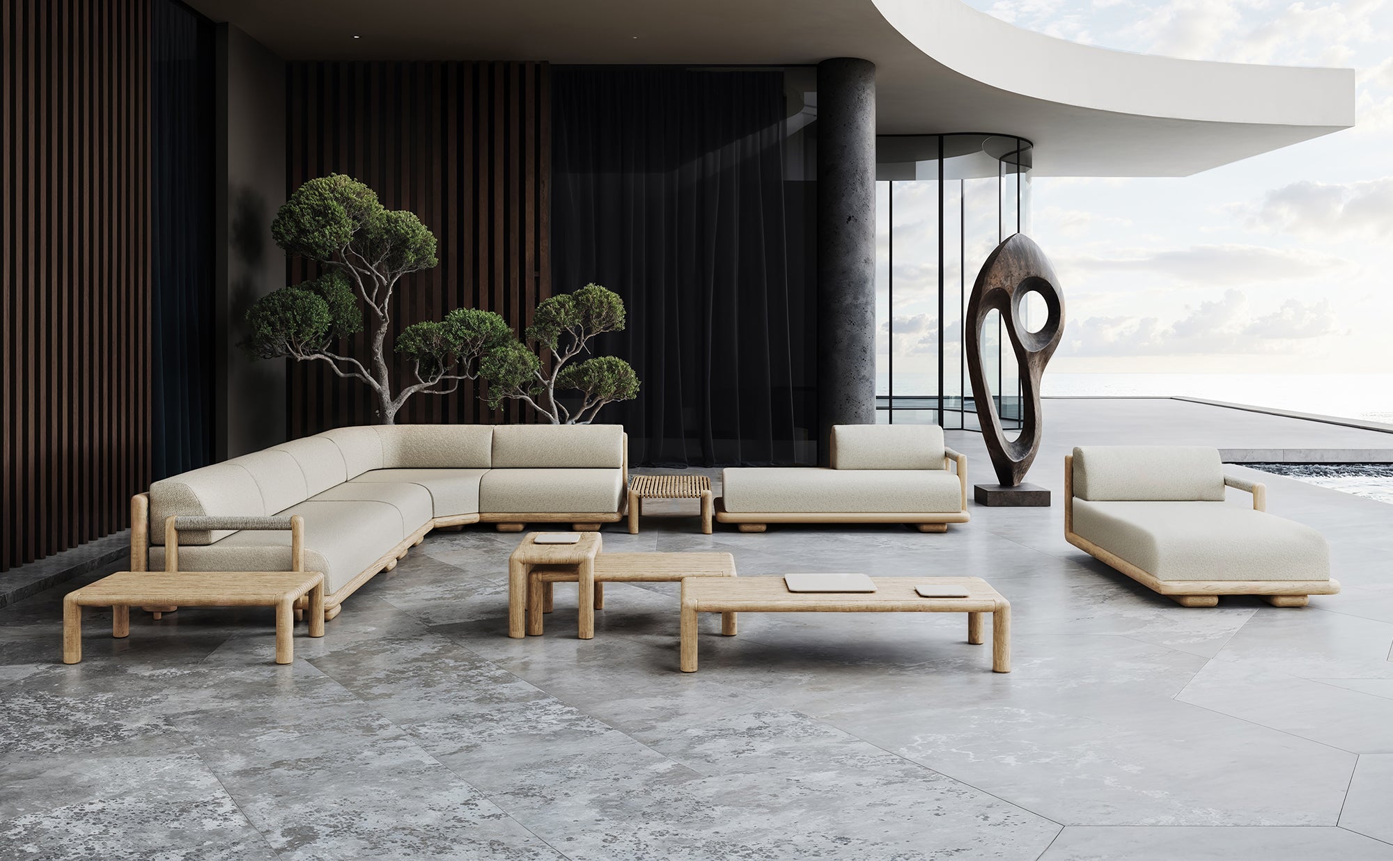 SNOC Collections with Sunbrella fabric details suitable for Natural Teak and Black Teak color options, and a coffee table designed from sand and epoxy materials; The lounge and dining set and daybed are included.
