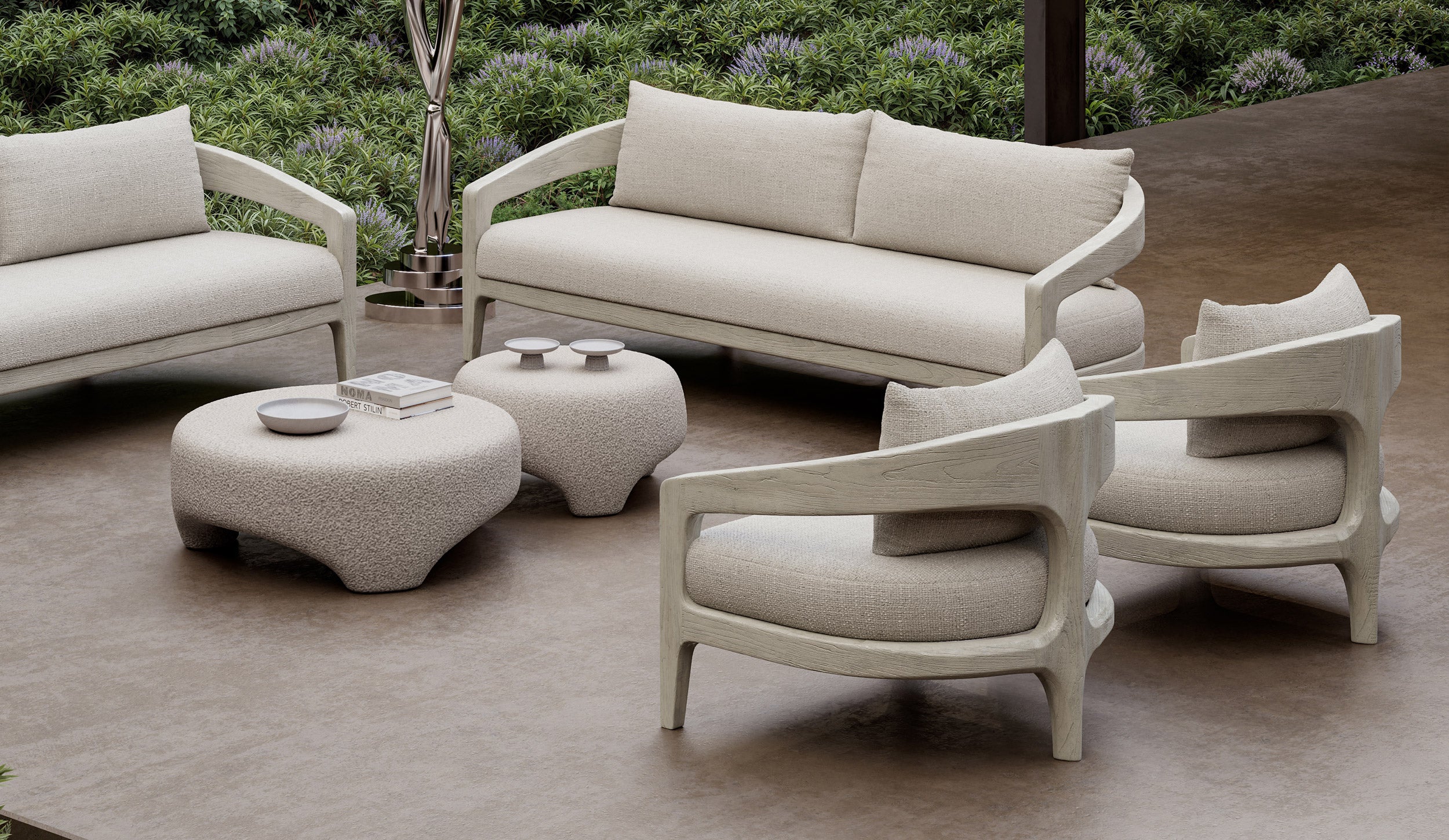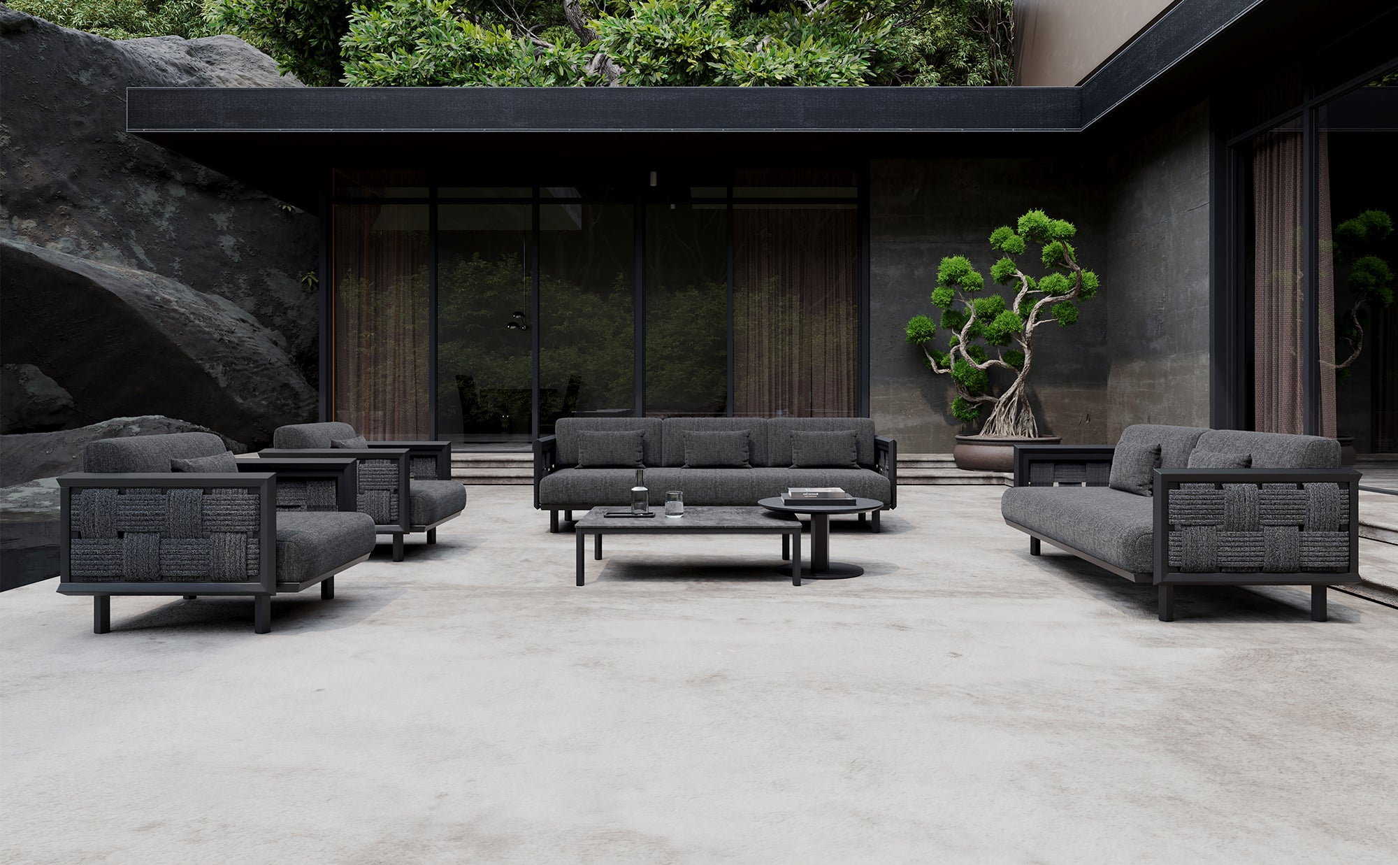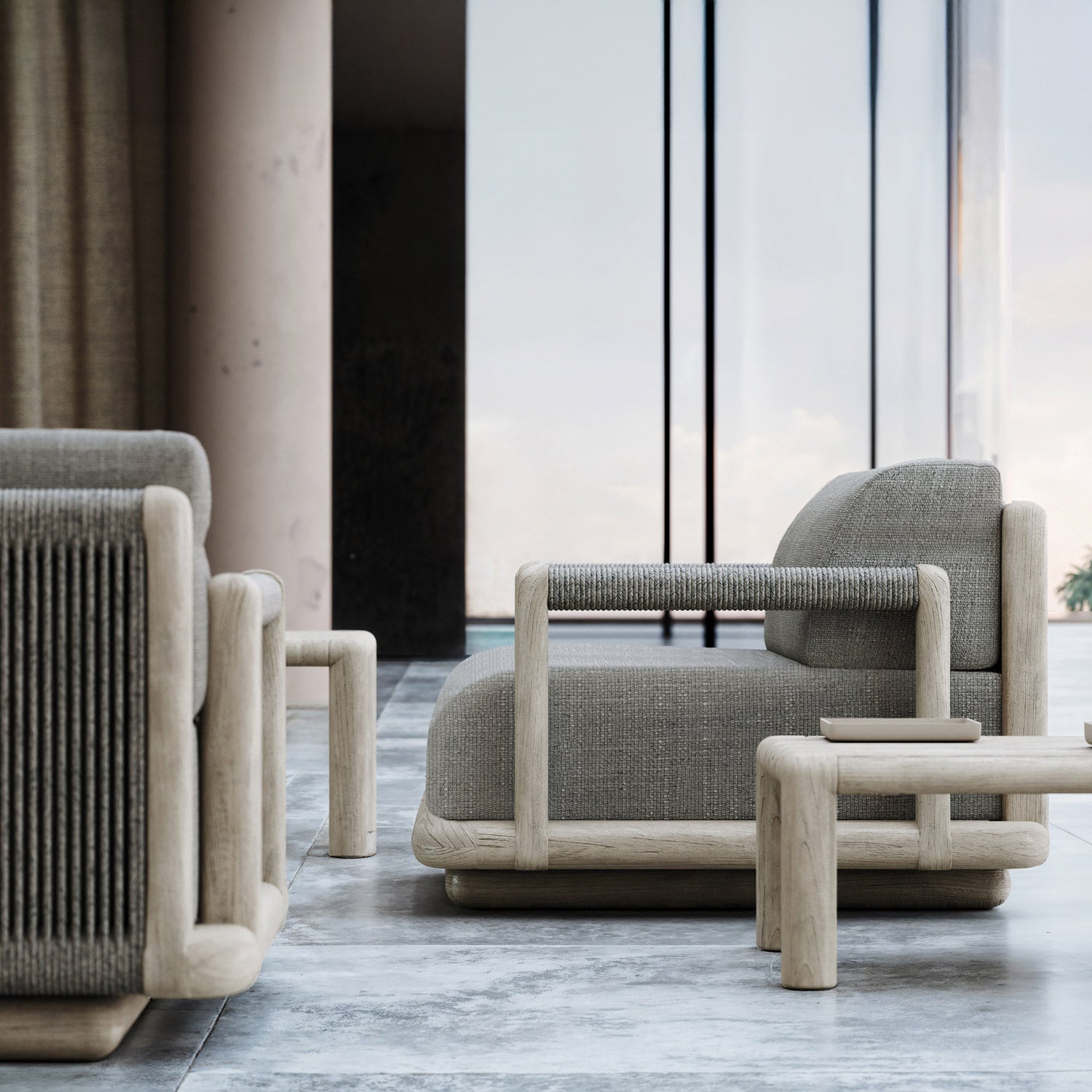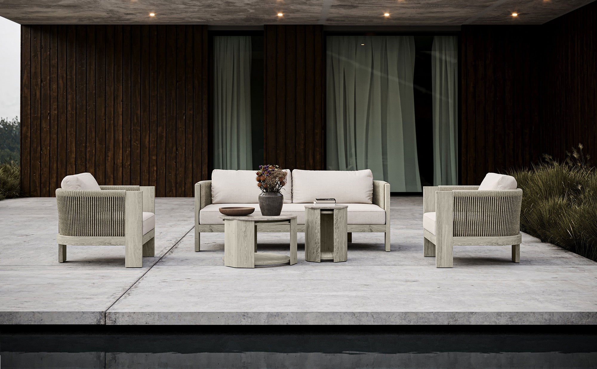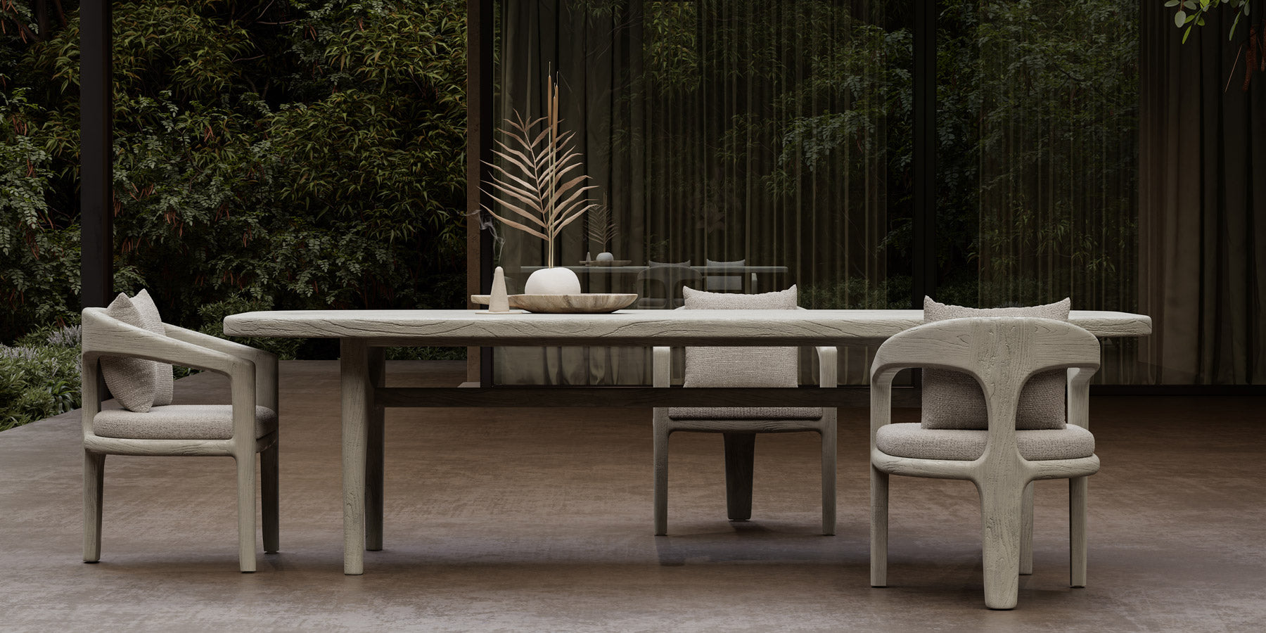 SNOC Collections with Sunbrella fabric details suitable for Natural Teak and Black Teak color options, and a coffee table designed from sand and epoxy materials; The lounge and dining set and daybed are included.