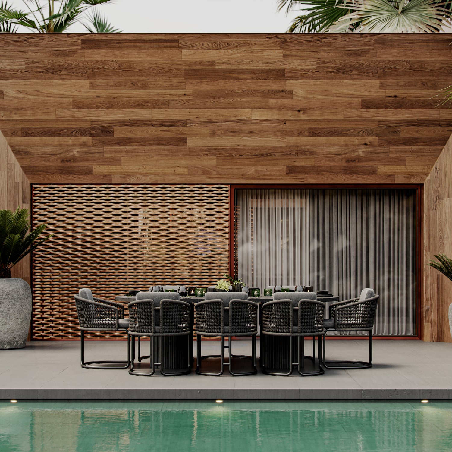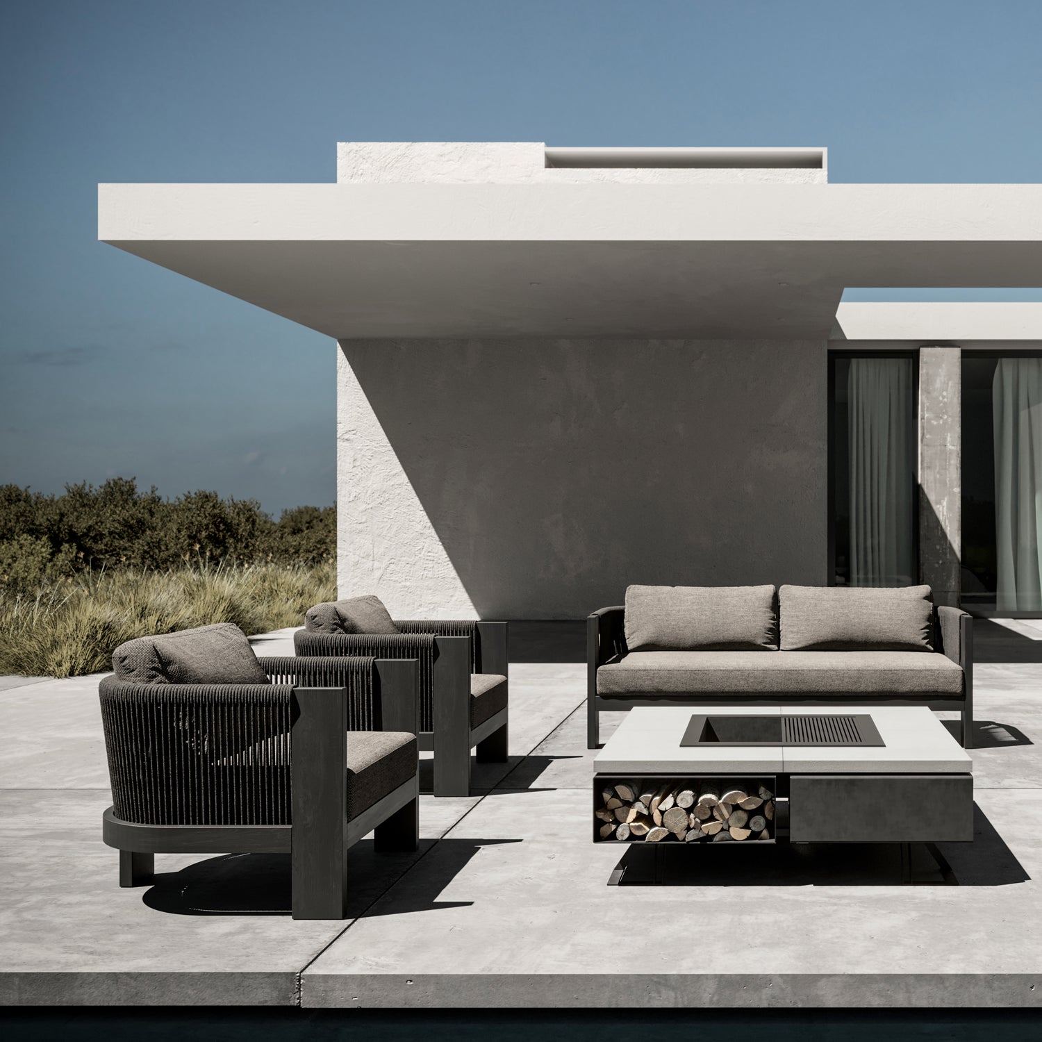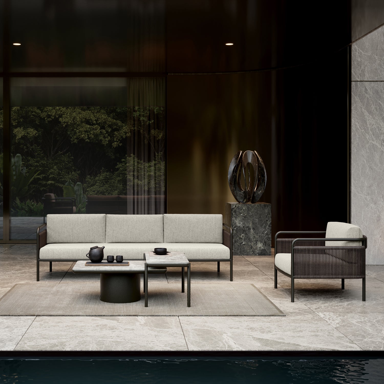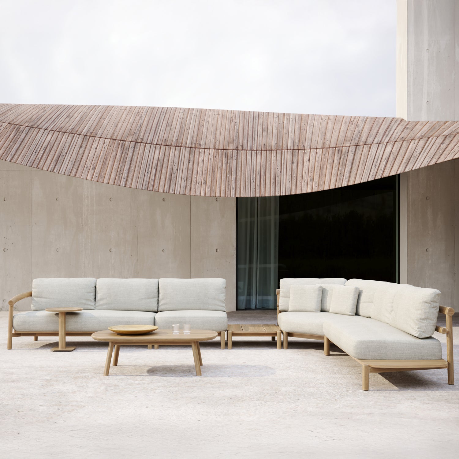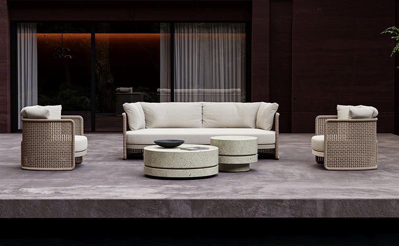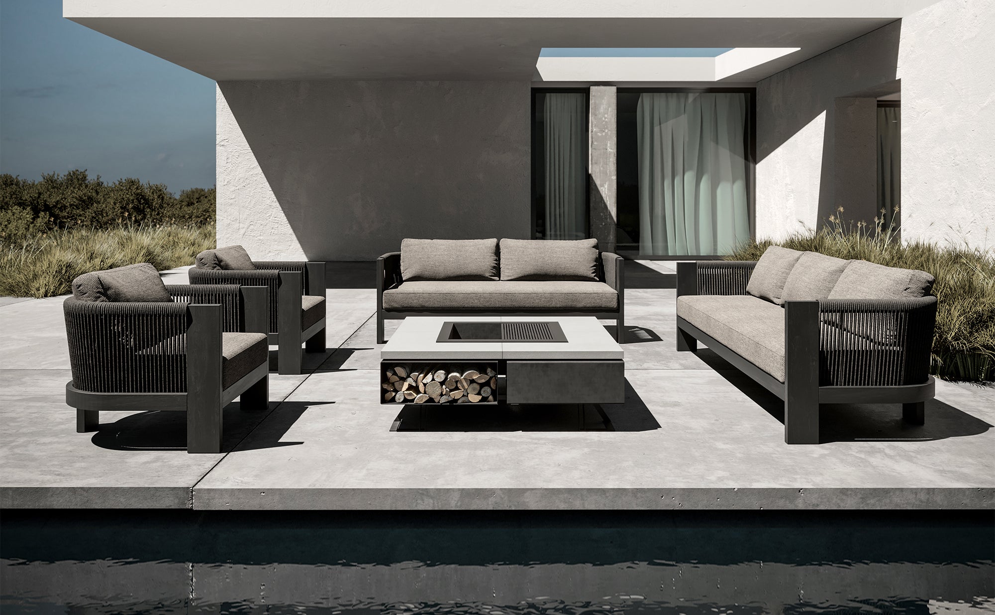 SNOC Collections with Sunbrella fabric details suitable for Natural Teak and Black Teak color options, and a coffee table designed from sand and epoxy materials; The lounge and dining set and daybed are included.