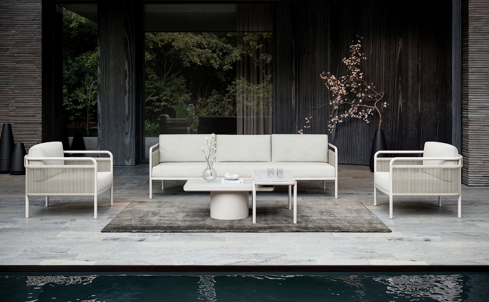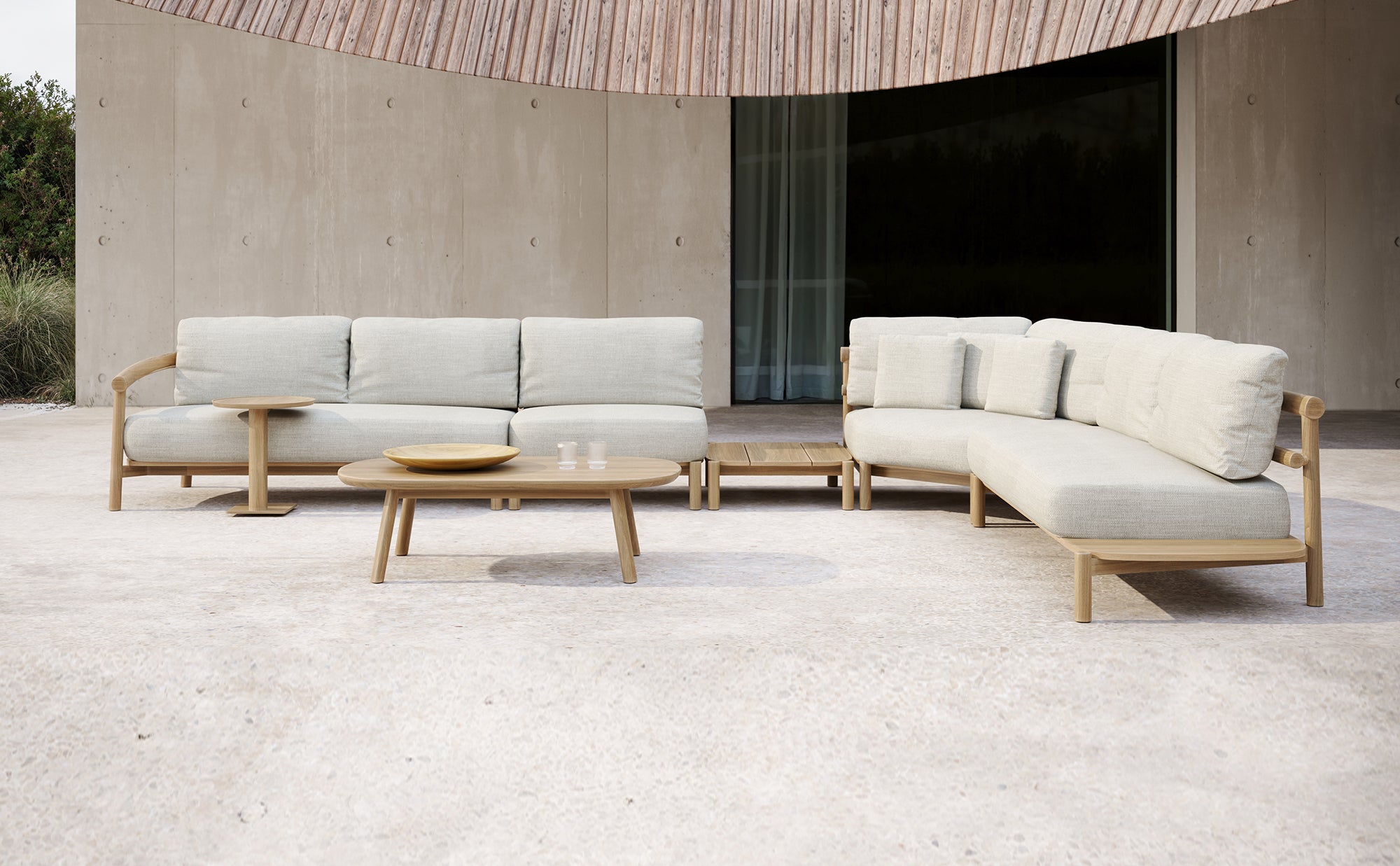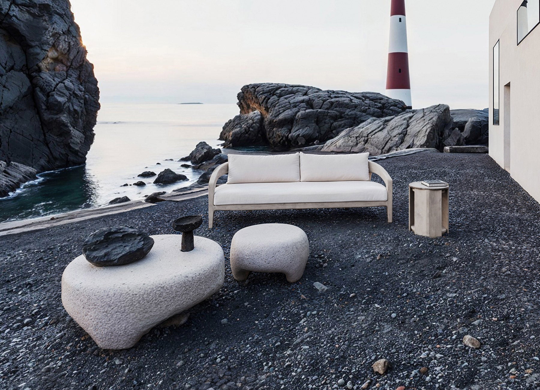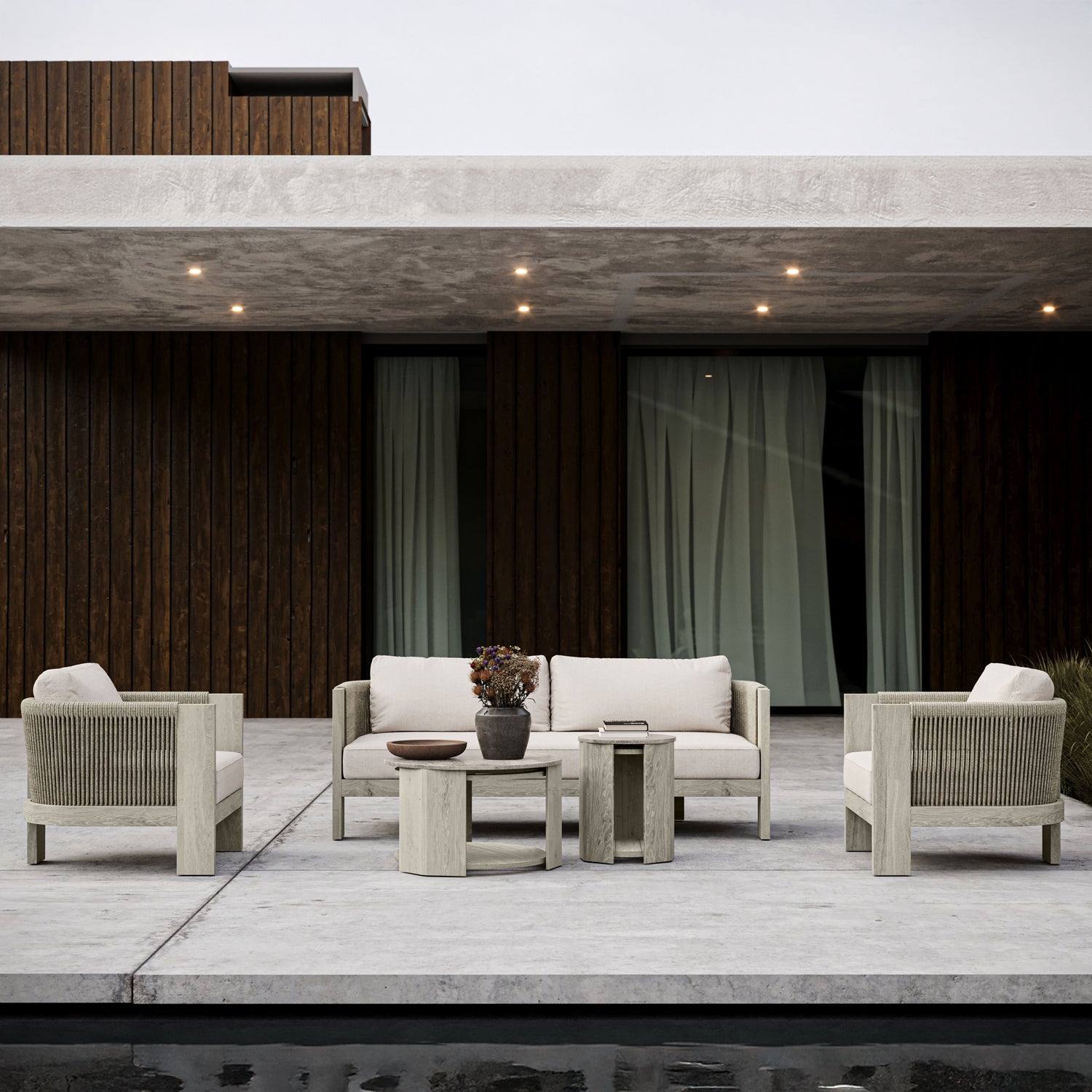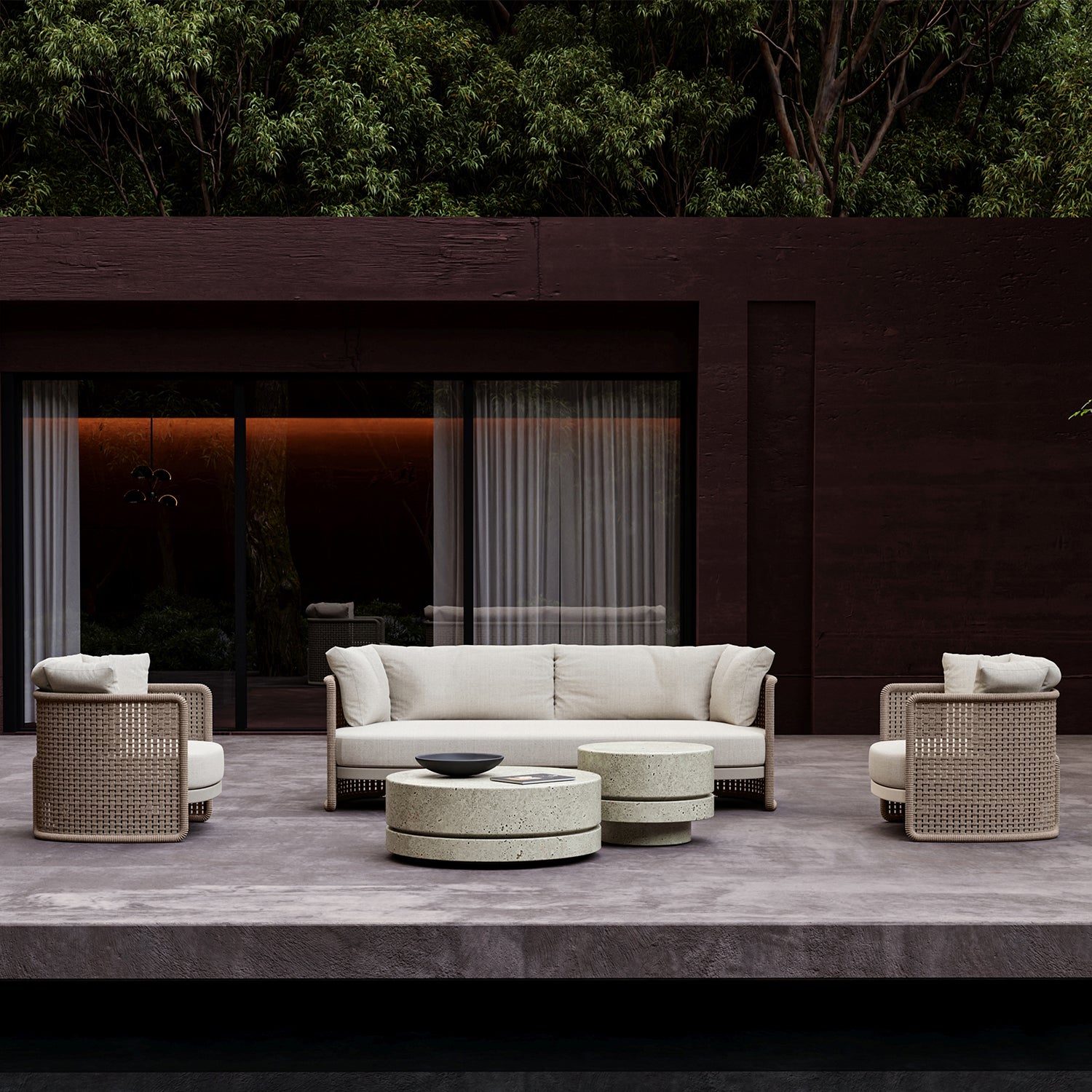 SNOC Collections with Sunbrella fabric details suitable for Natural Teak and Black Teak color options, and a coffee table designed from sand and epoxy materials; The lounge and dining set and daybed are included.