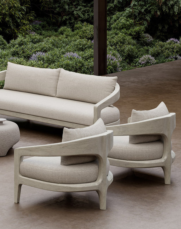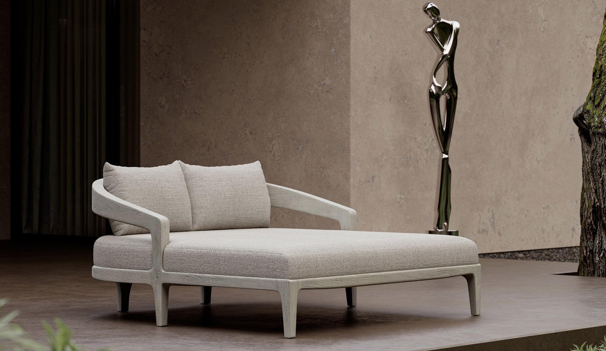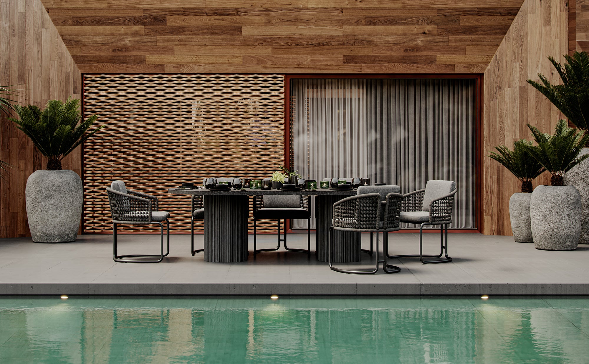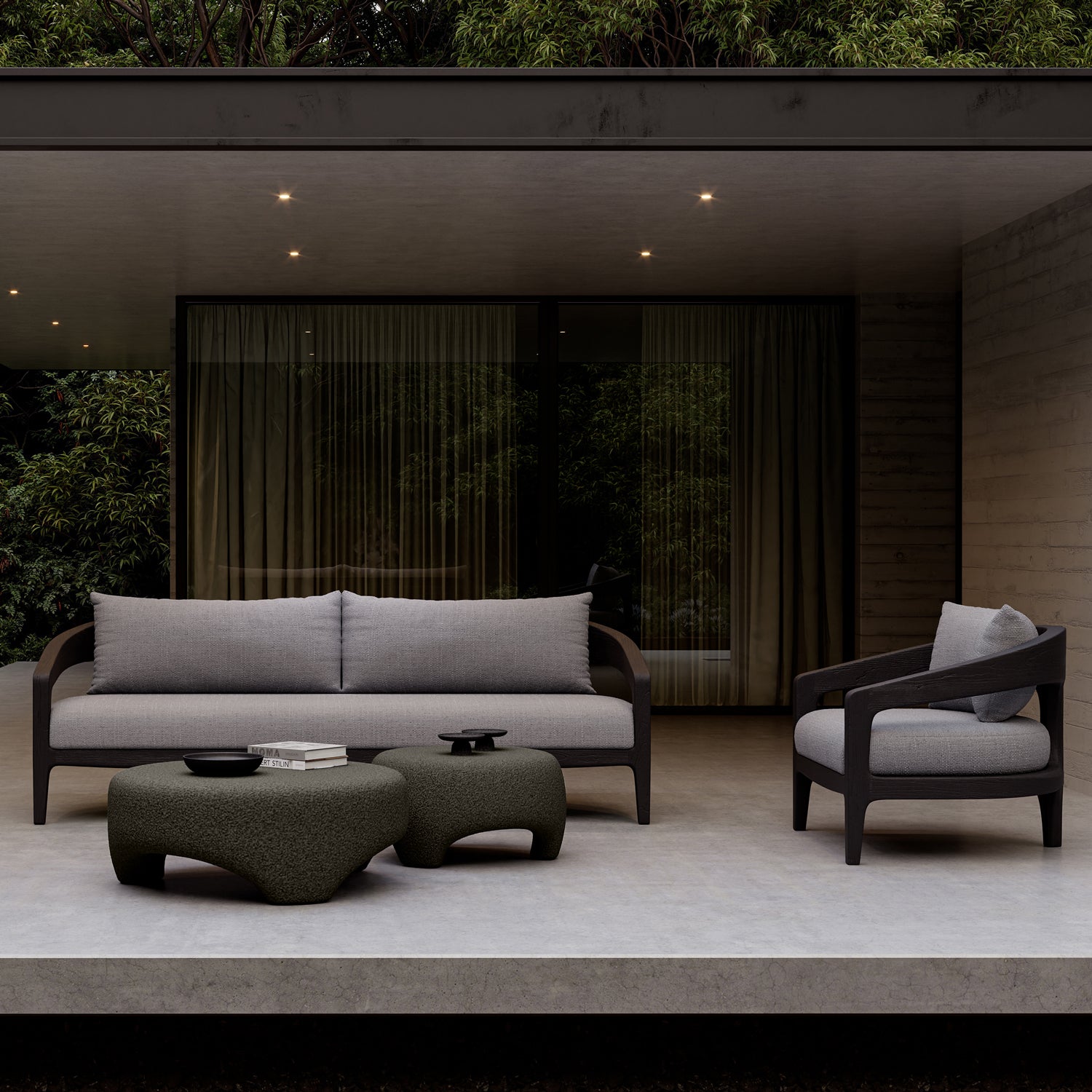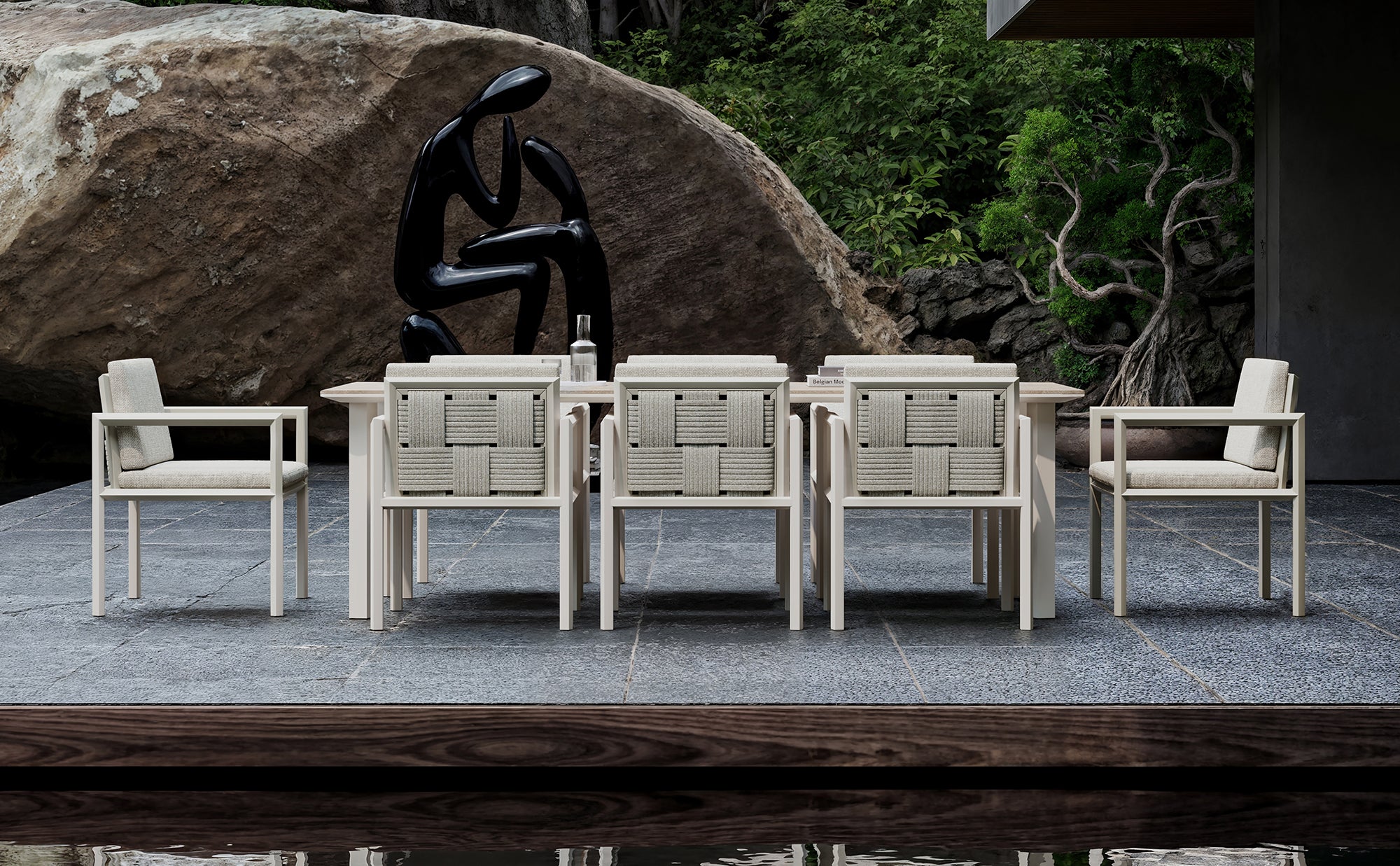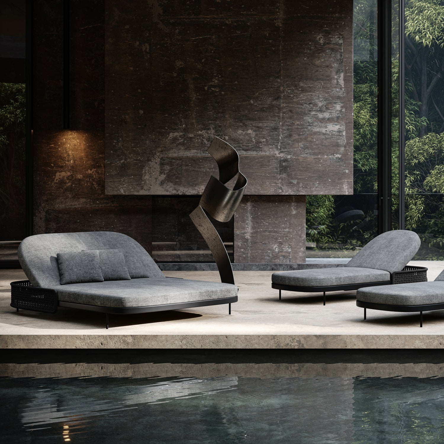SNOC Collections with Sunbrella fabric details suitable for Natural Teak and Black Teak color options, and a coffee table designed from sand and epoxy materials; The lounge and dining set and daybed are included.