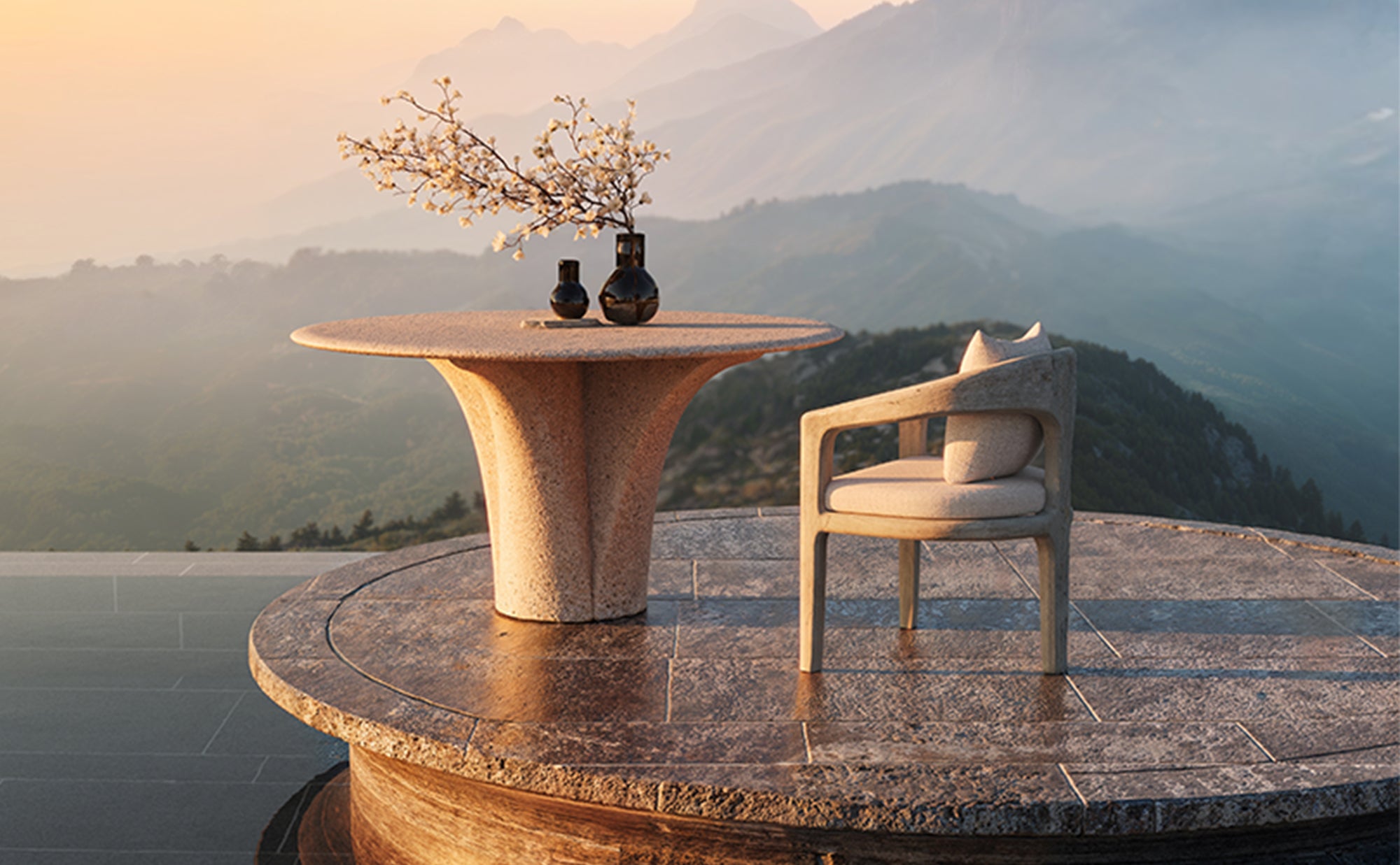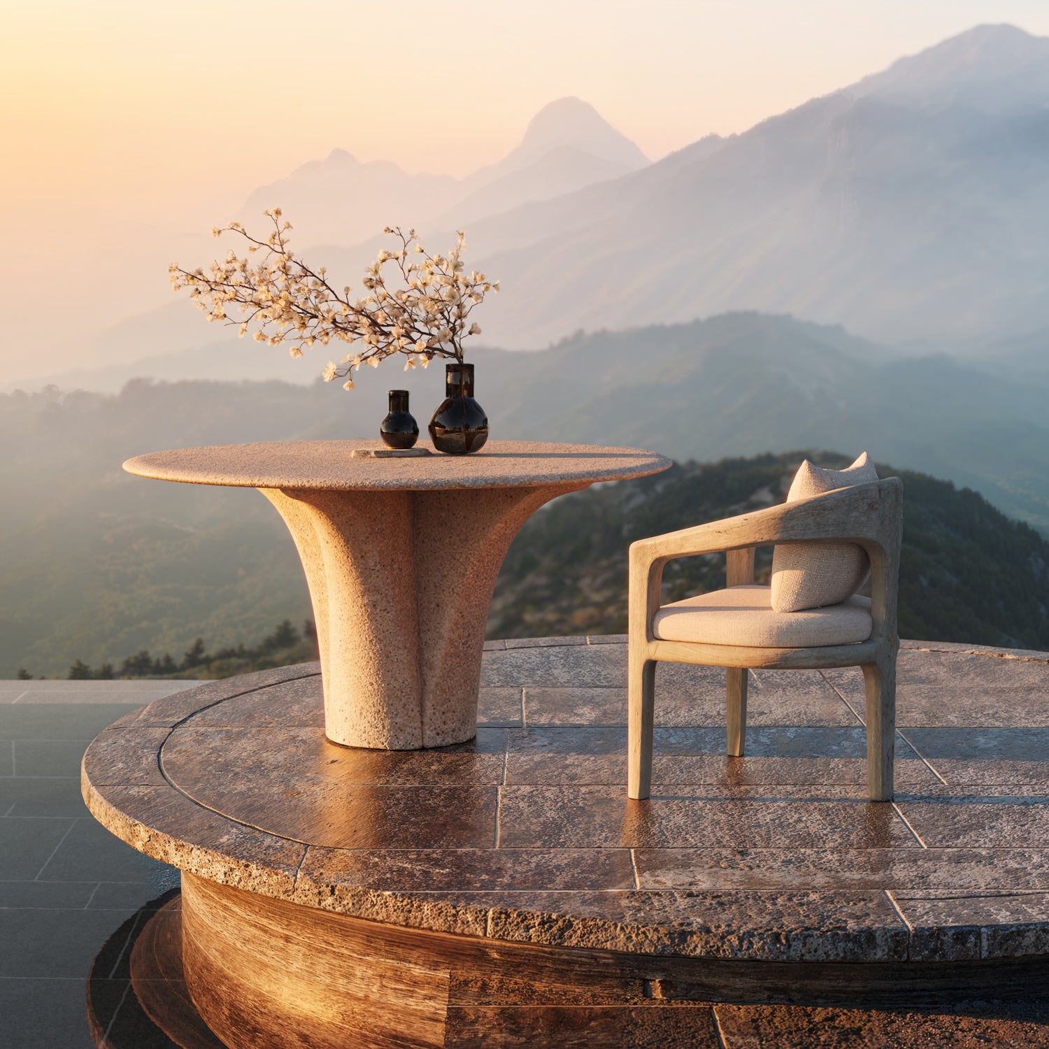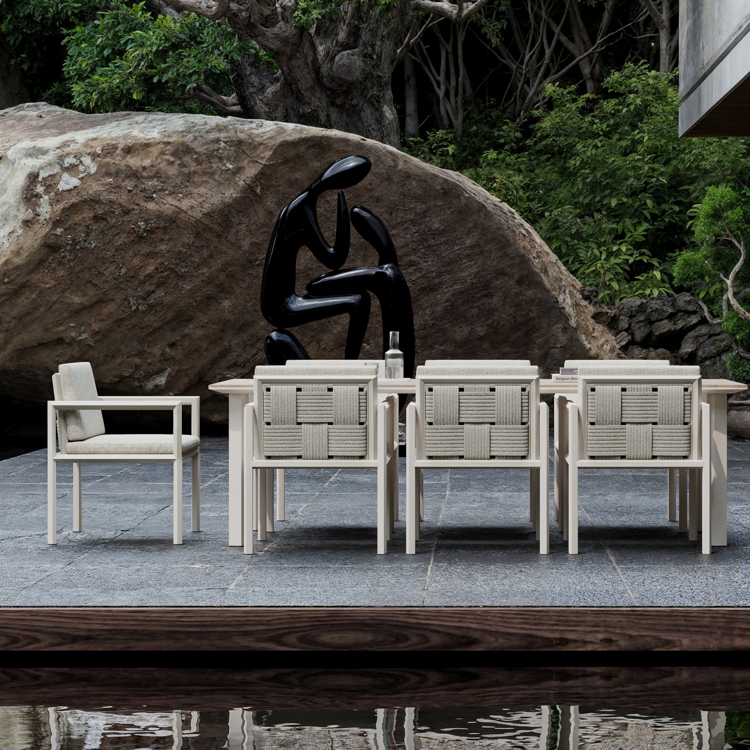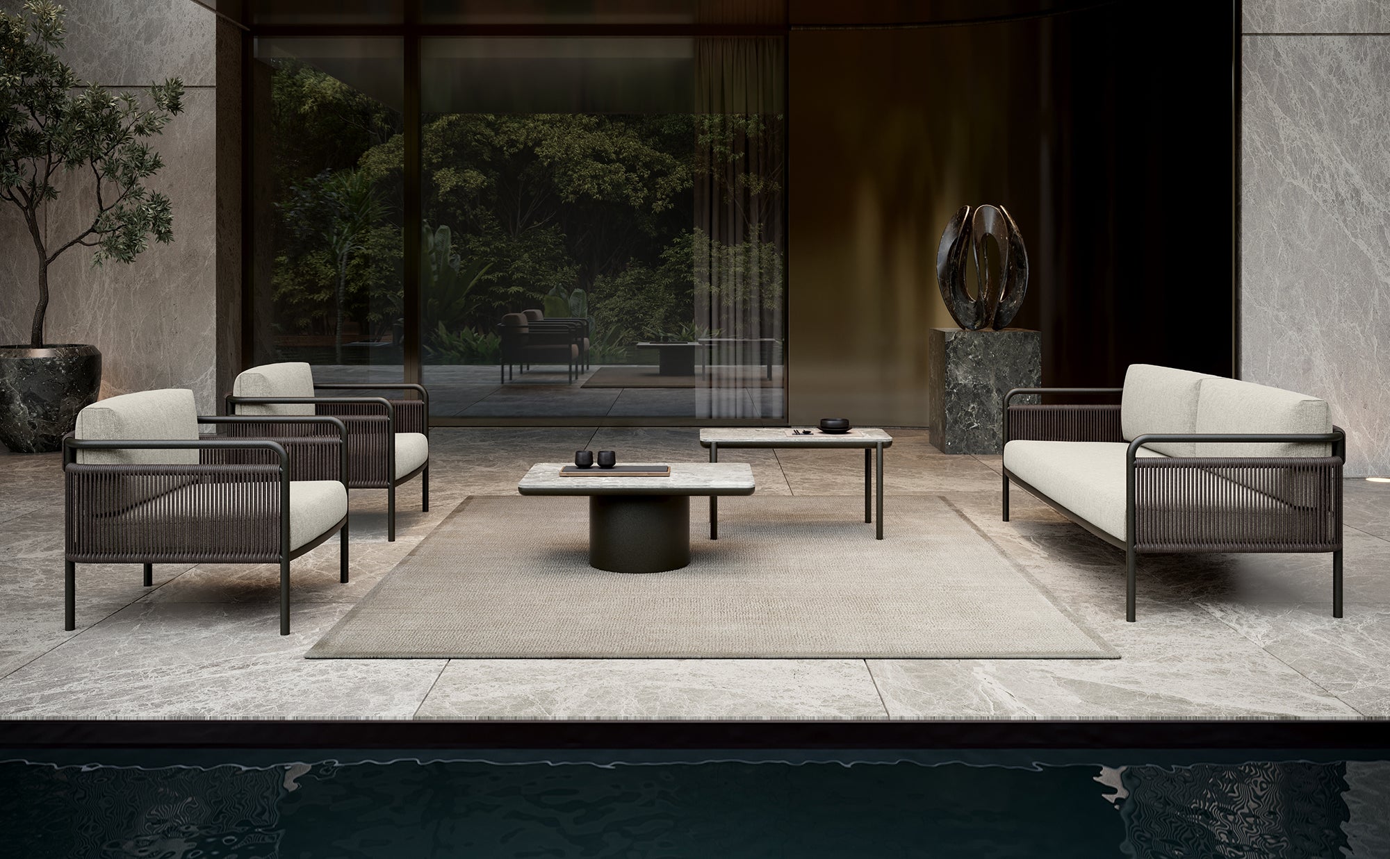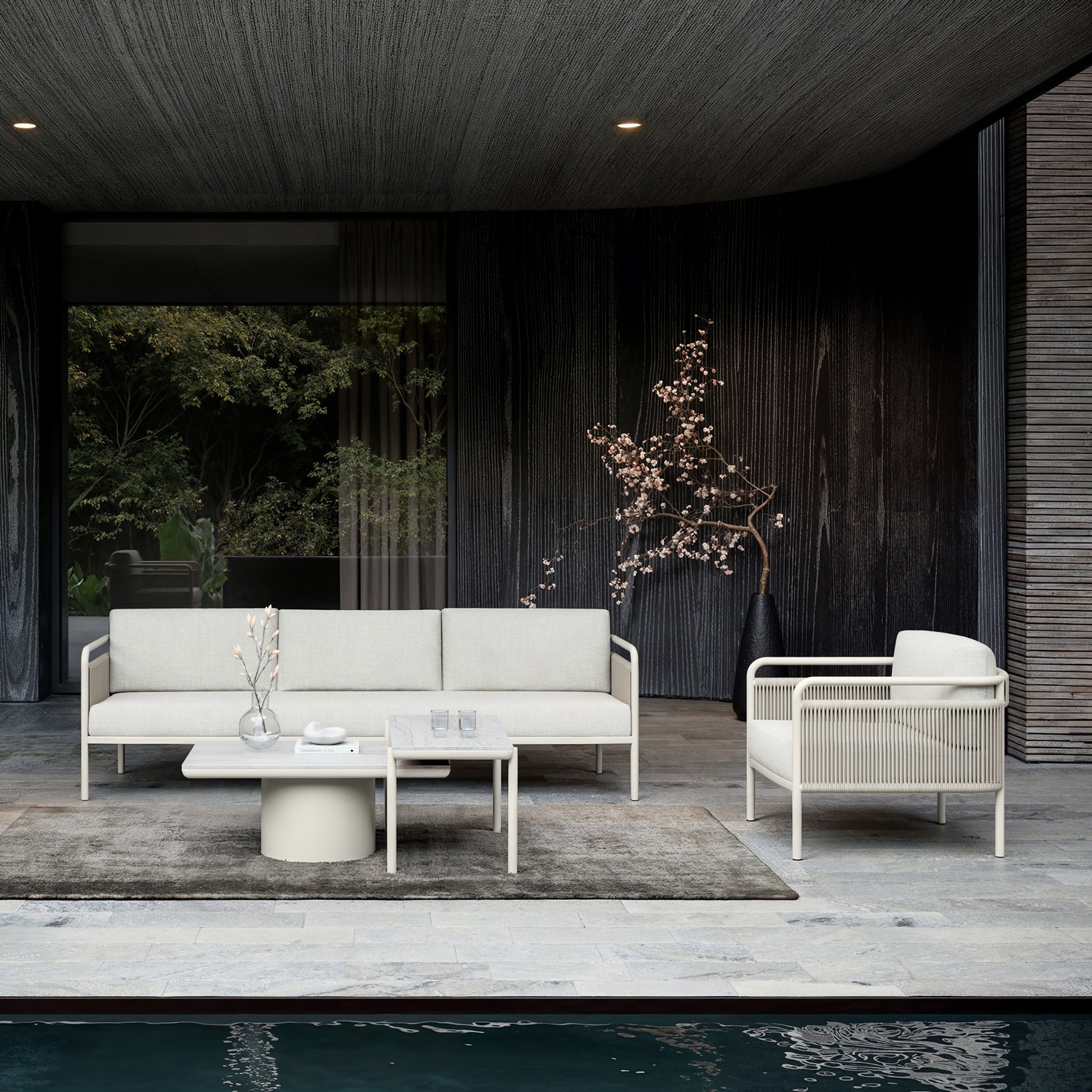 SNOC Collections with Sunbrella fabric details suitable for Natural Teak and Black Teak color options, and a coffee table designed from sand and epoxy materials; The lounge and dining set and daybed are included.