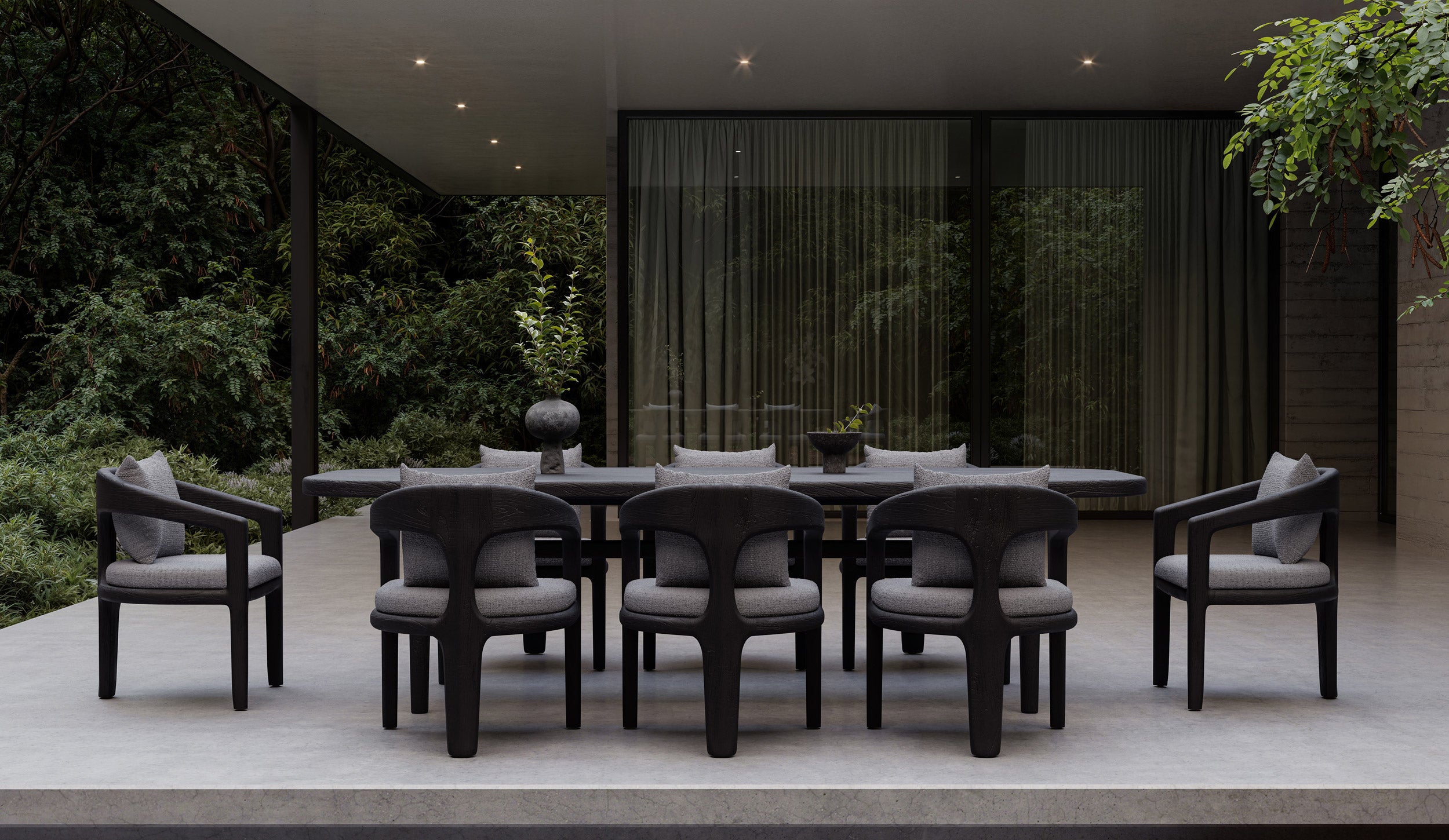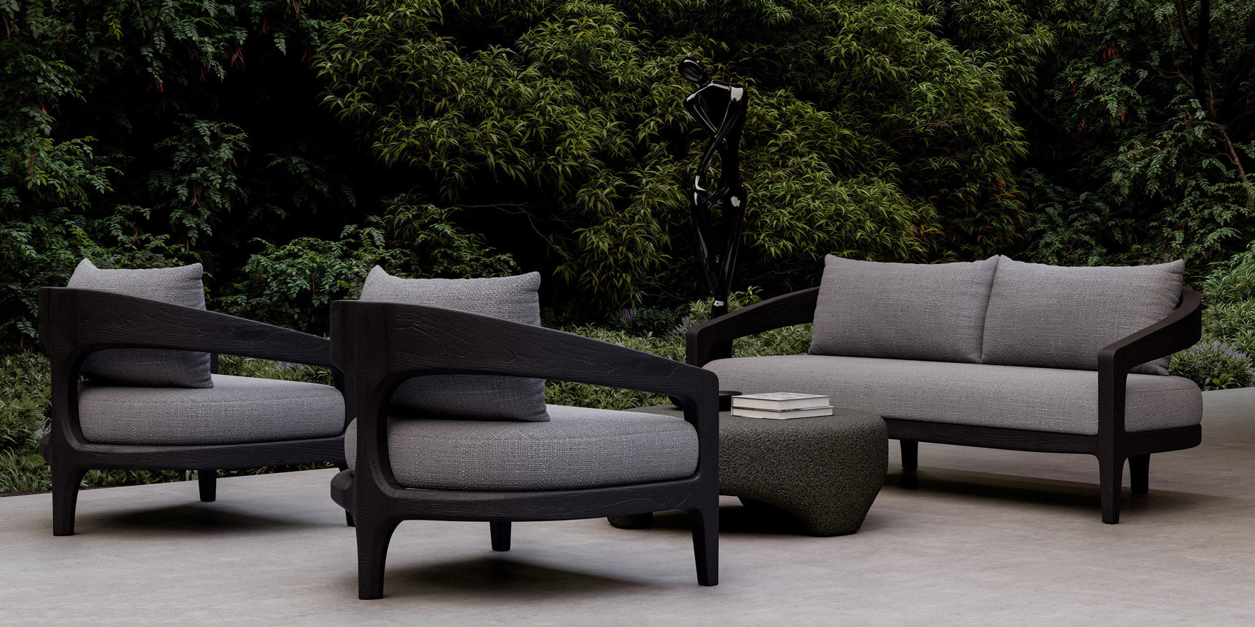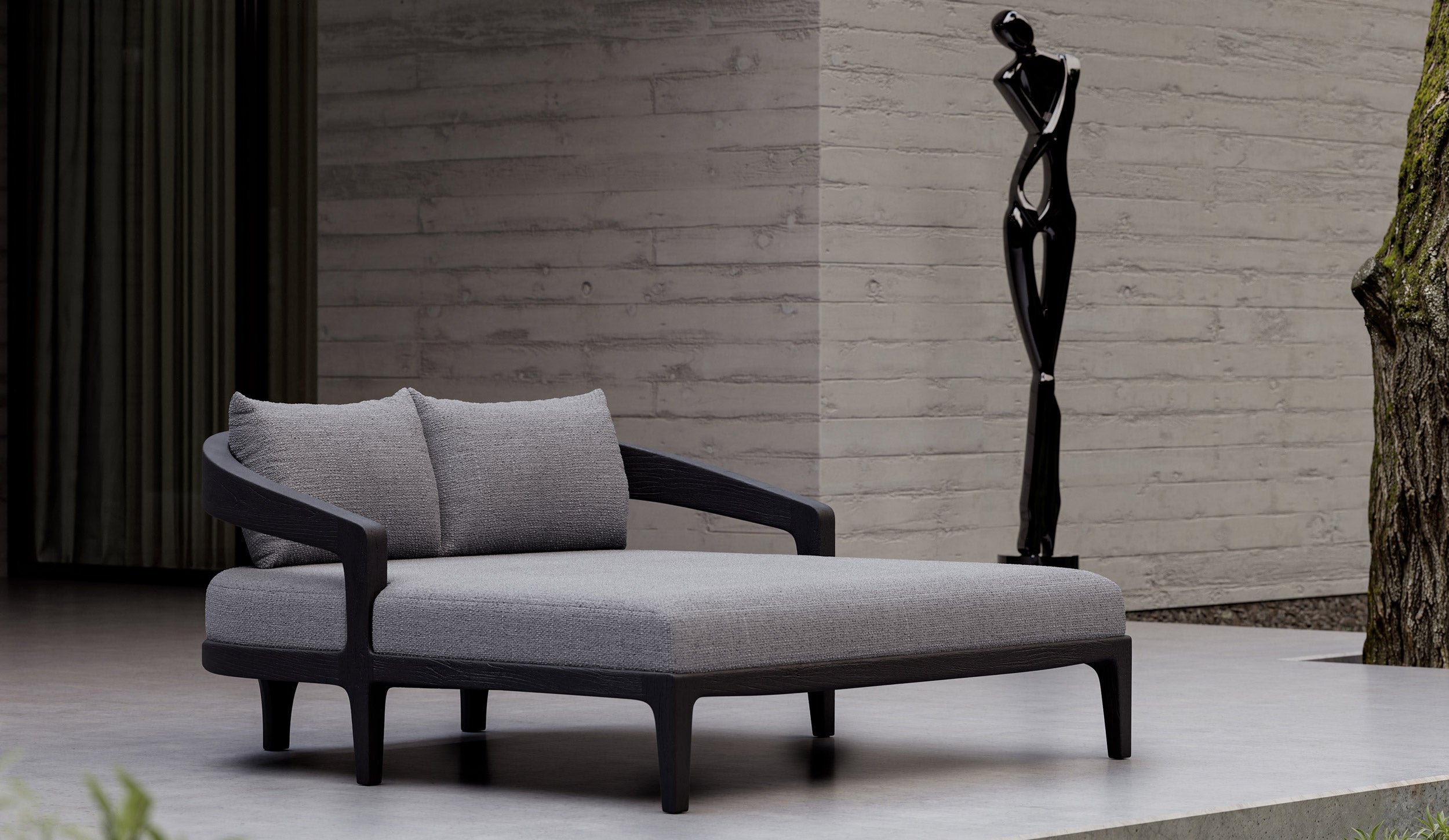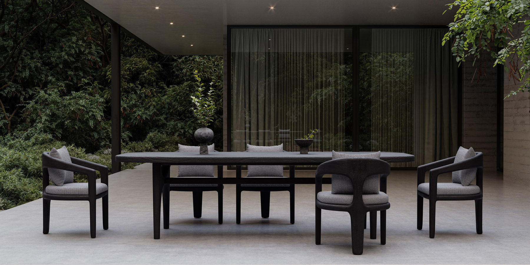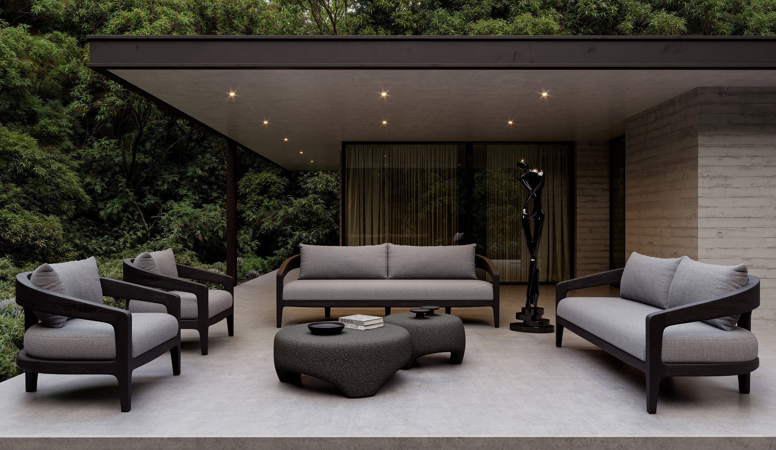 SNOC Collections with Sunbrella fabric details suitable for Natural Teak and Black Teak color options, and a coffee table designed from sand and epoxy materials; The lounge and dining set and daybed are included.