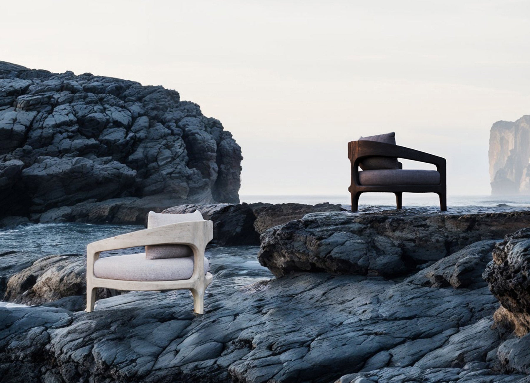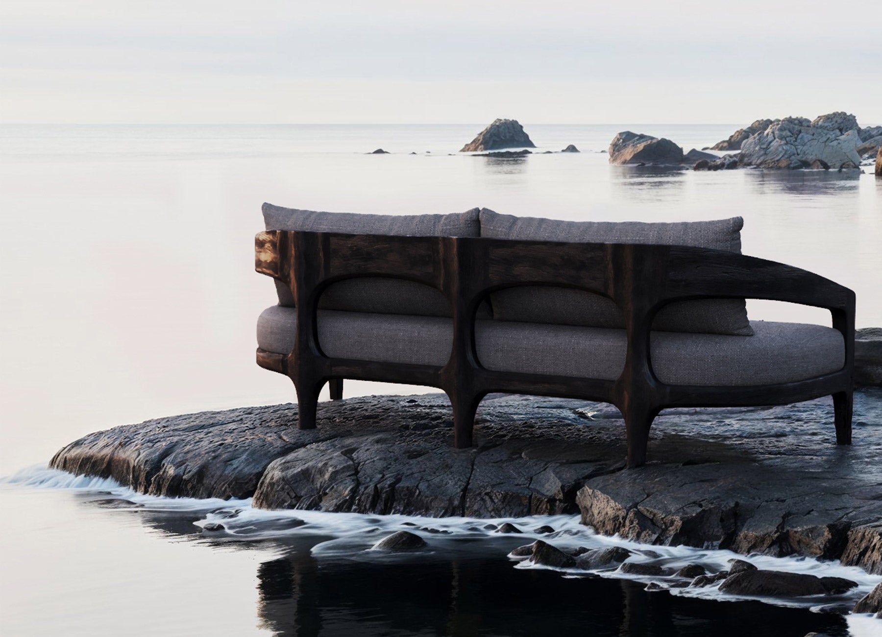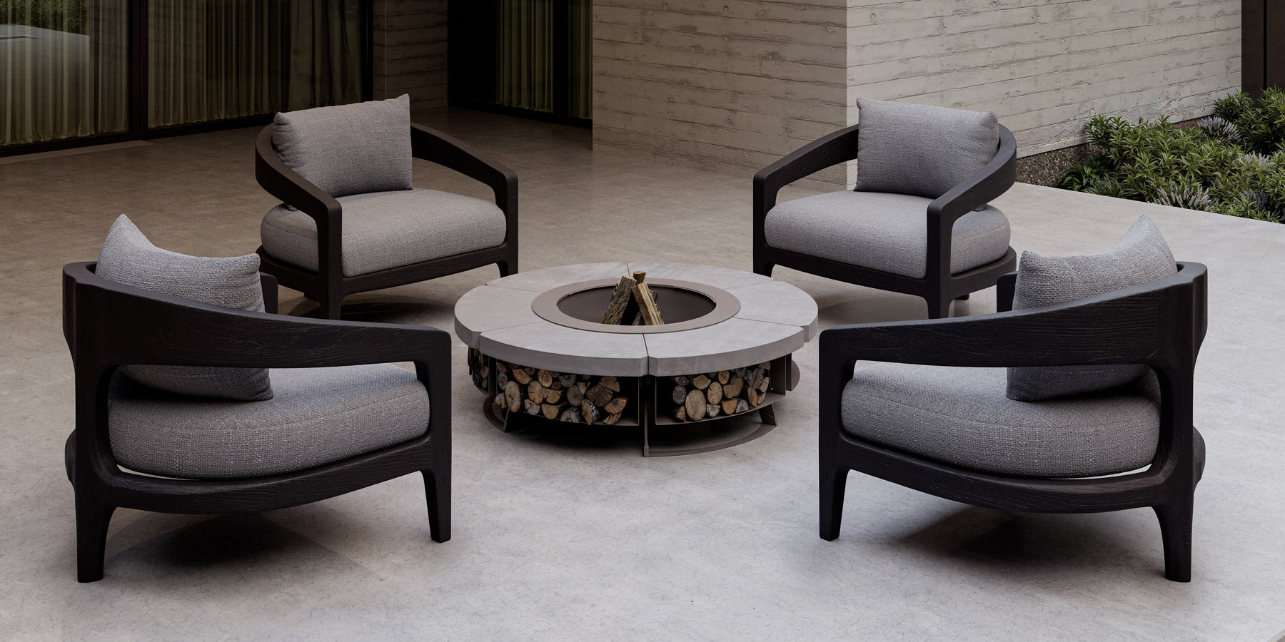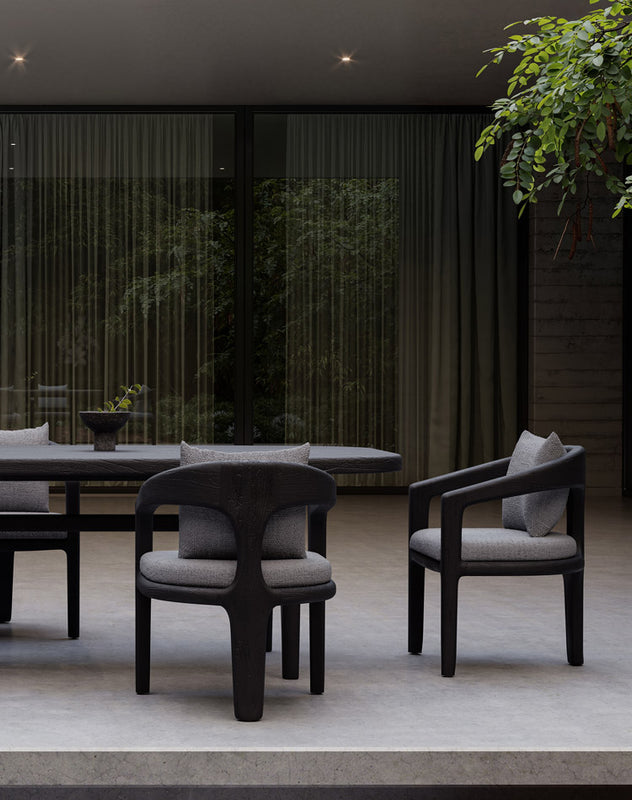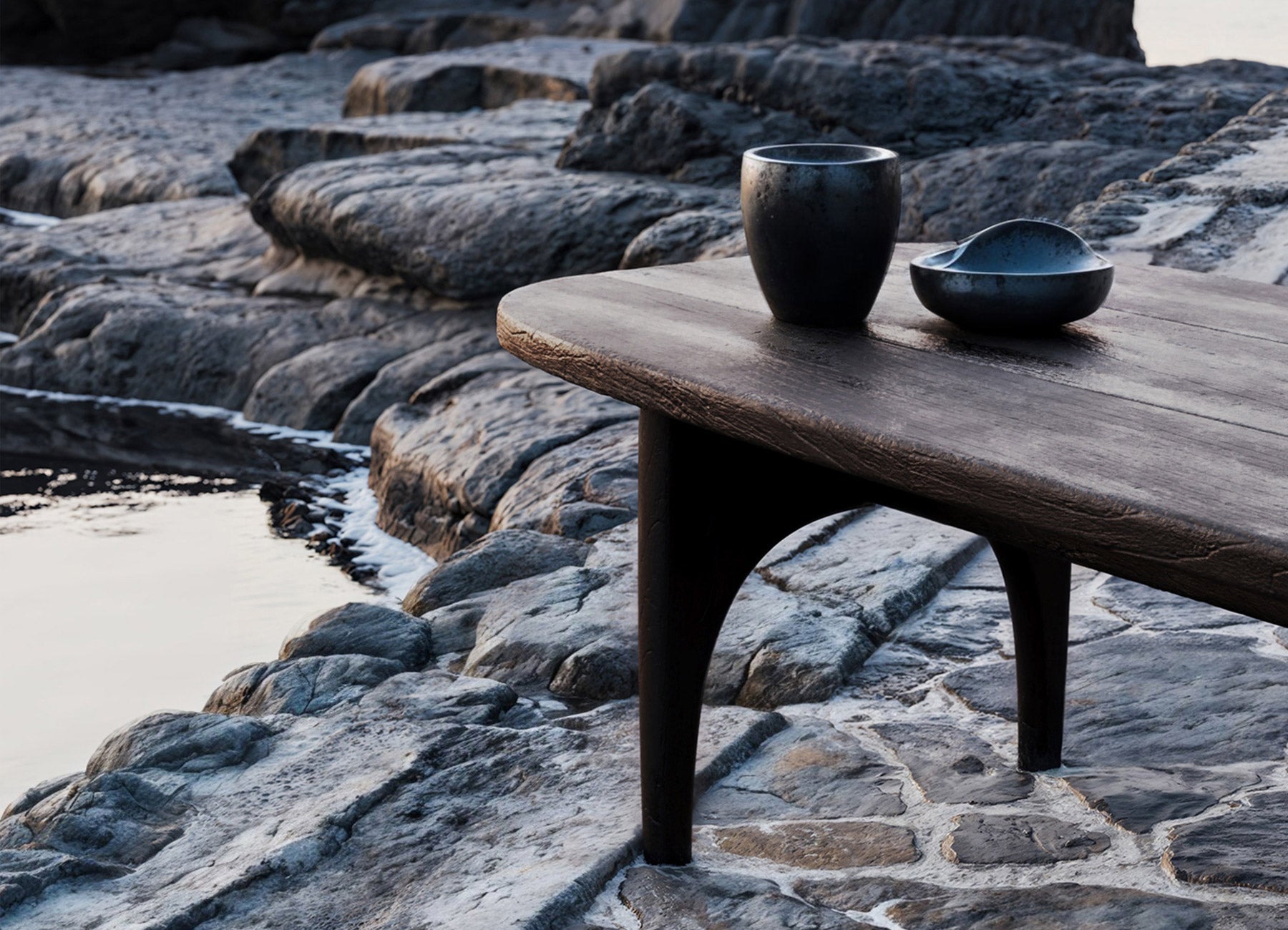 SNOC Collections with Sunbrella fabric details suitable for Natural Teak and Black Teak color options, and a coffee table designed from sand and epoxy materials; The lounge and dining set and daybed are included.