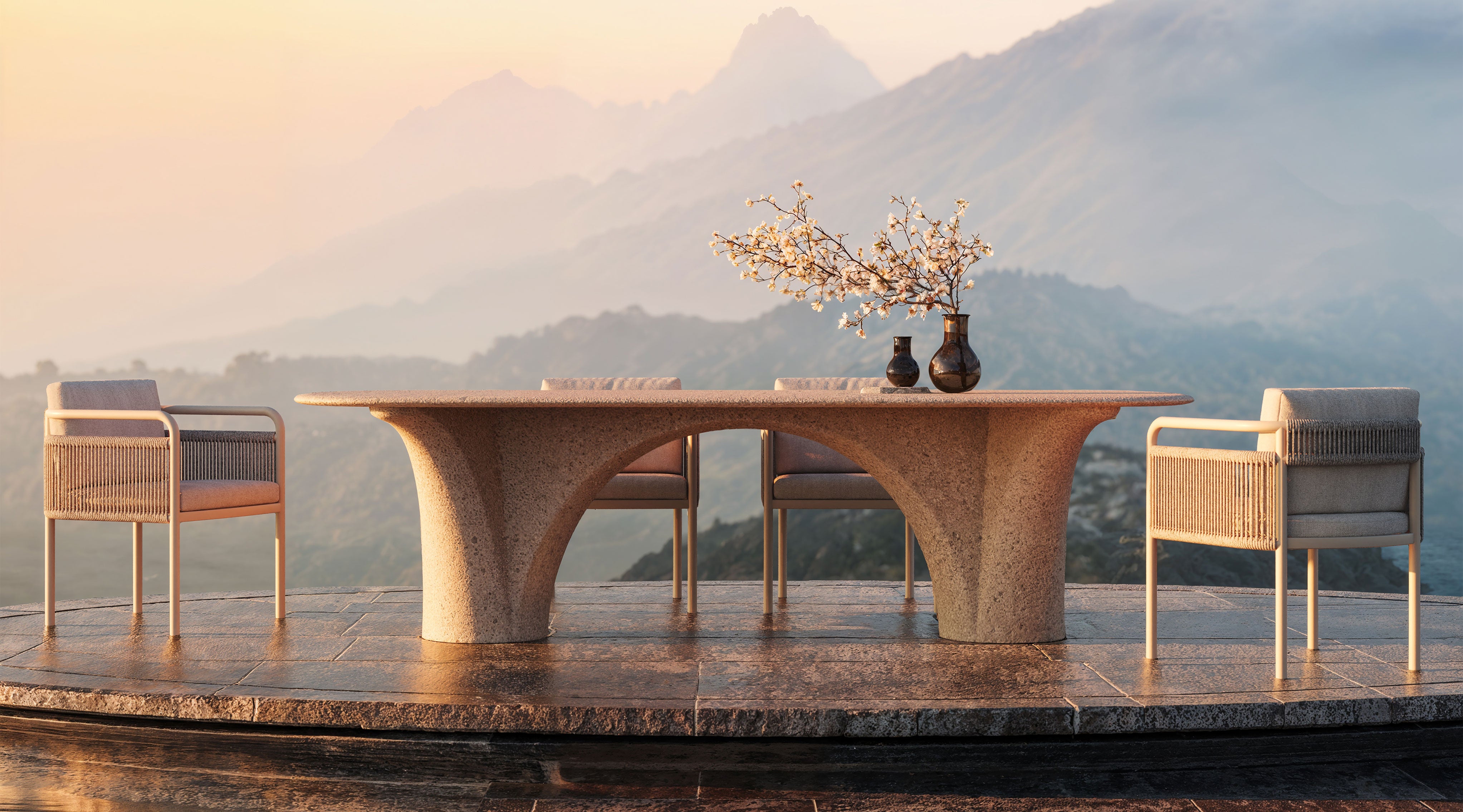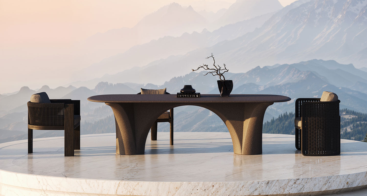 The unique textured finish of tables and lightings diffuses light giving the surface a sophisticated complexity. Savio Tables are the definitive statement piece for both indoor and outdoor living. A perfect place for large gatherings and celebrations. Light and shadow softly transition as the tables change in appearance throughout the day exposing details in the geometry.