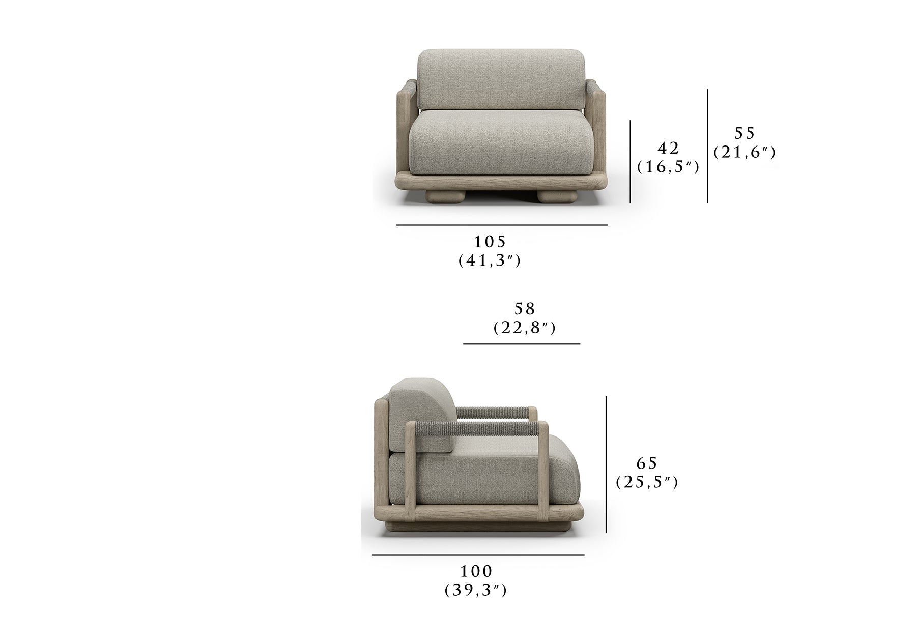Armchair: 105 cm x 100 cm x 65 cm